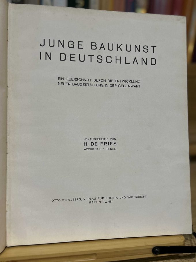 Junge Baukunst in Deutschland. Ein Querschnitt durch die Entwicklung neuer Baugestaltung in der Gegenwart von H. de Fries ist eine tiefgehende Studie der modernen Architektur in Deutschland. Veröffentlicht in Berlin von Otto Stollberg im Jahr 1926, ist dieses einbändige Werk eine Erstausgabe. Mit den Maßen 30 cm mal 24 cm zeichnet es sich durch seinen Hardcover-Einband und die Fadenheftung aus. Der Zustand des Buches wird als „fein“ beschrieben.