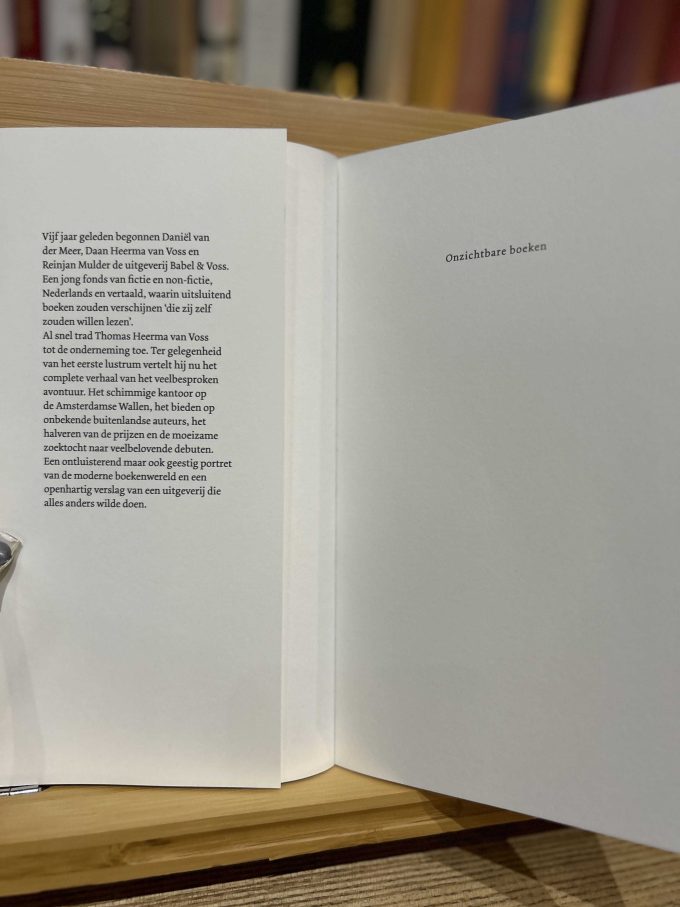 Het boek biedt een ironische kijk op de uitgeverswereld, waarbij Heerma van Voss zijn ervaringen deelt als redacteur bij Babel & Voss. Hij bespreekt hoe bepaalde boeken ondanks goede recensies en aandacht toch nauwelijks verkocht worden en daarmee ‘onzichtbaar’ blijven in de markt. Het werk is doorspekt met licht spottende humor en biedt een blik op de uitdagingen van het zichtbaar maken van boeken bij het publiek.