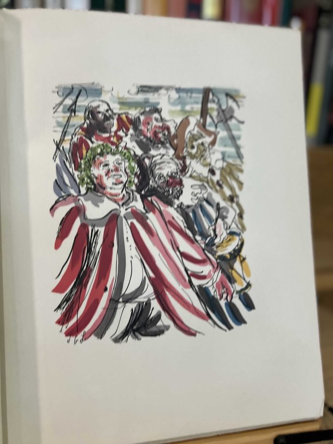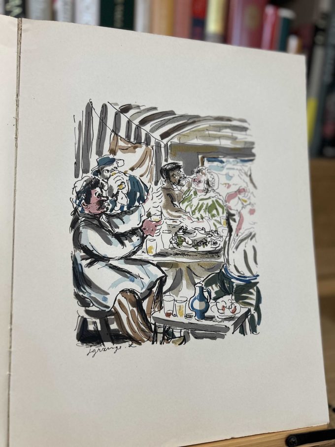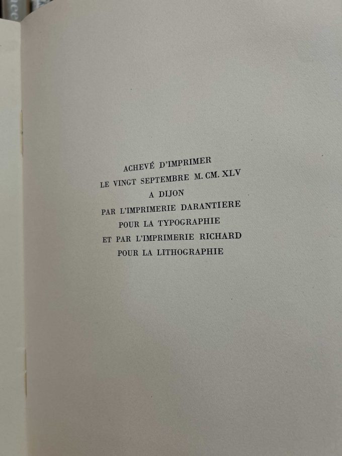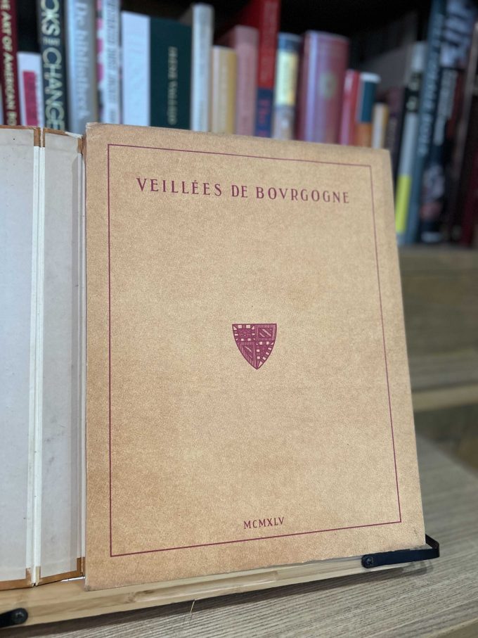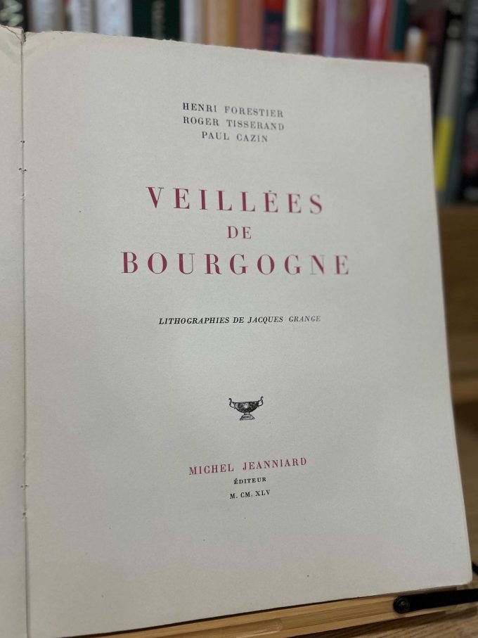 Forestier, Henri – Tisserand, Roger – Cazin, Paul. [Illustrated by Grange, Jacques]. Veillées de Bourgogne. Dijon: Michel Jeanniard, 1945. Printed by Darantiere / Richard, Dijon. 210 pages. 1 Volume. [First Edition]. Limited edition of 900 copies. 33,2 cm. x 25,8 cm. Softcover. Sewn binding. Illustrations: illustrated with 26 color lithographs. Condition: Fine. Large quarto softcover, in a ornate orange folded chemise.