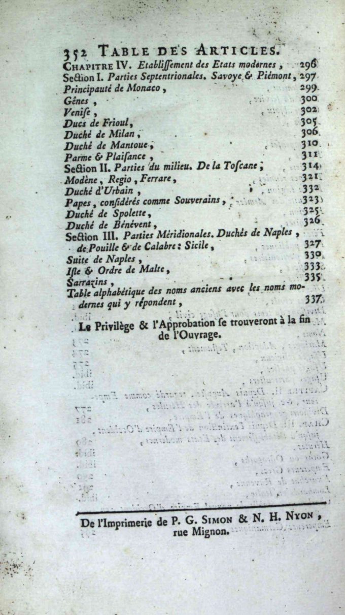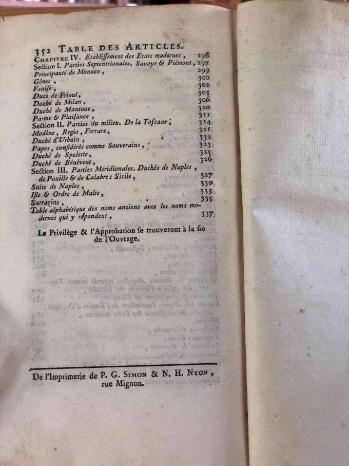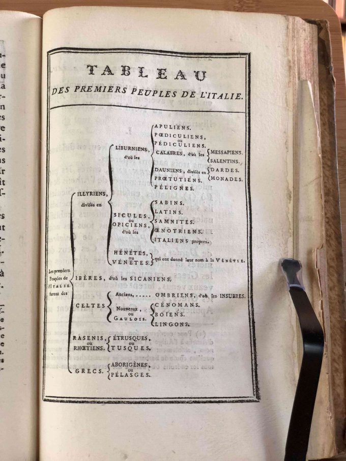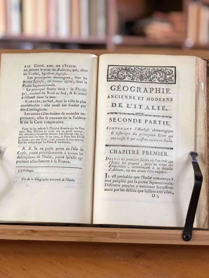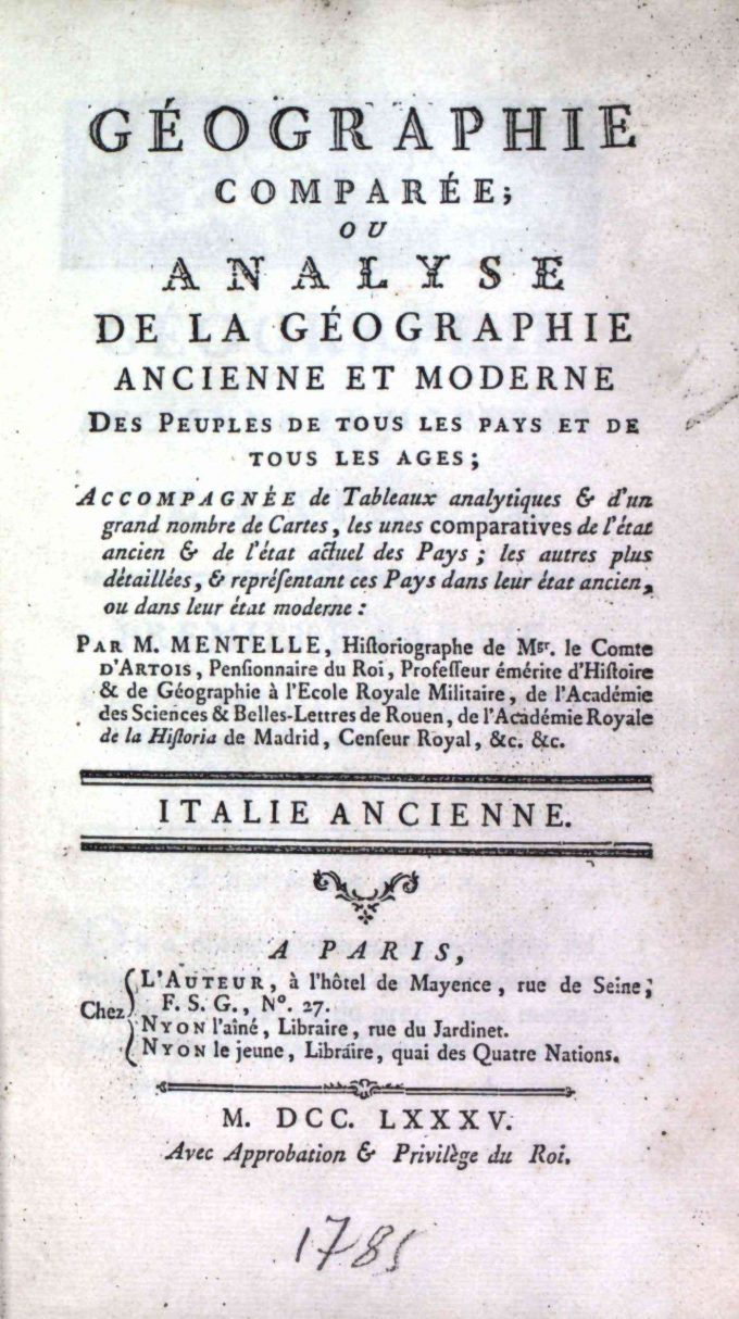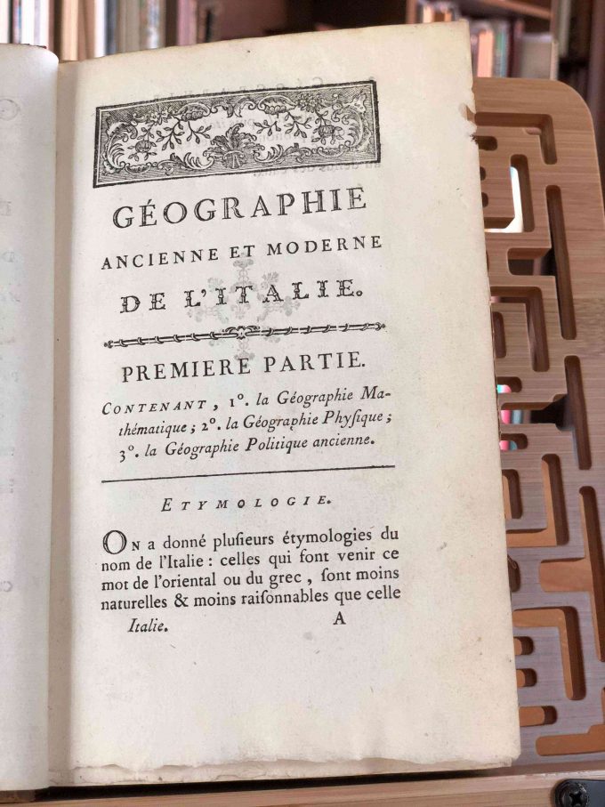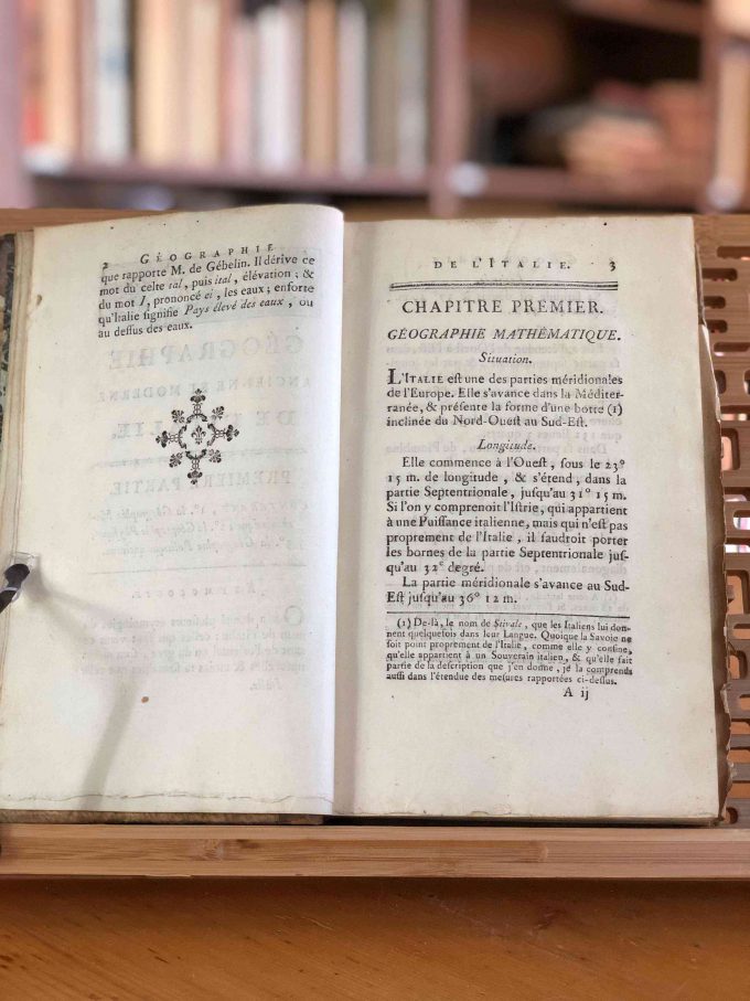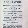 Géographie Comparée – Italie Ancienne. Ou Analyse De La Géographie Ancienne Et Moderne Des Peuples De Tous Les Pays Et De Tous Les Ages par M. Mentelle, publié en 1785 par L’Auteur – Nyon l’ainé – Nyon le jeune à Paris, comprend 352 pages. Ce volume est en bon état avec une reliure à un quart en cuir et papier, et un ex-libris sur la page de garde avant : Ex Bibliotheca Armandi de Behault.