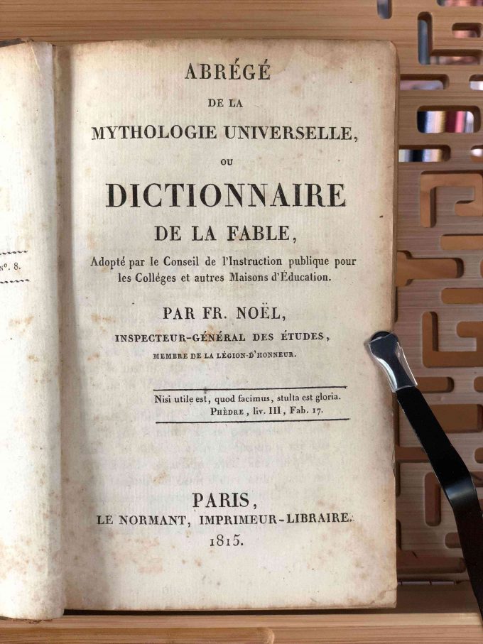 Abrégé de la mythologie universelle, ou dictionnaire de la fable de Fr. Noël est un ouvrage publié en 1815 par Le Normant, Imprimeur-Libraire, à Paris. Cet exemplaire contient 661 pages et is een enkel volume. Bien que l’édition soit inconnue, le livre est en état moyen avec une reliure à un quart en cuir et papier.