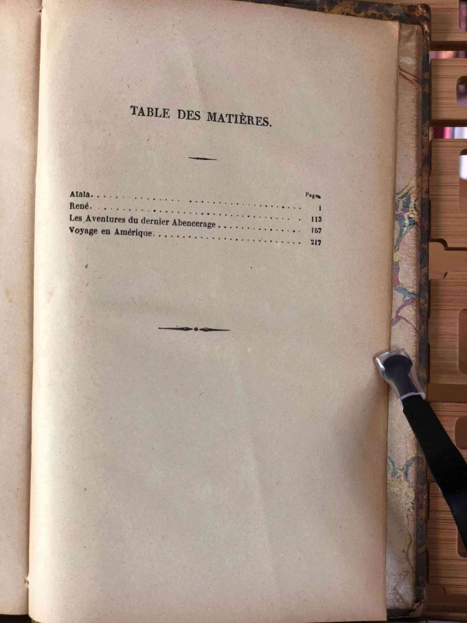 de Chateaubriand, François René. Atala / René / Les aventures du dernier abencerage / Voyages en Amérique. Paris: Firmin-Didot Et Cie, [publishing date unknown]. 525 pages. Series: Librairie De Paris. [Edition unknown]. One Quarter Binding (Leather-Paper). Sewn binding. Provenance: Received by Germaine Piot as a first price for “Solfège” [musical theory course]. Condition: Good Minus.