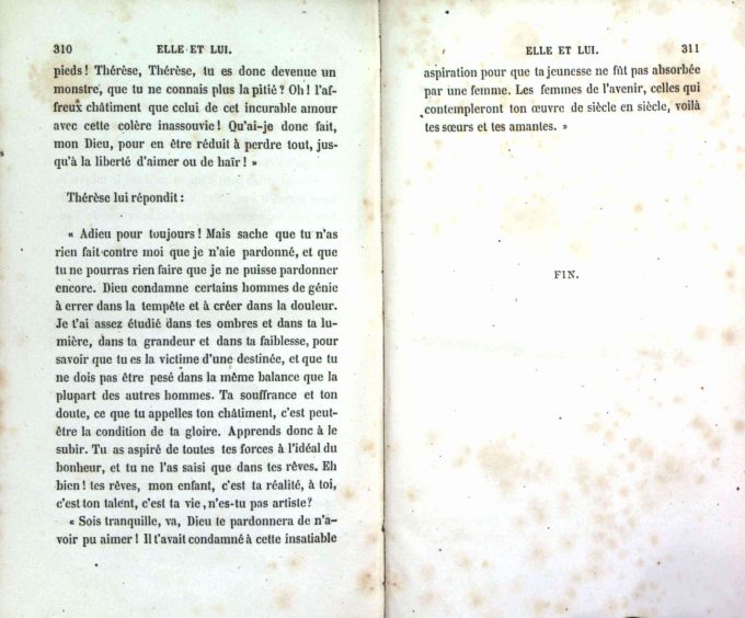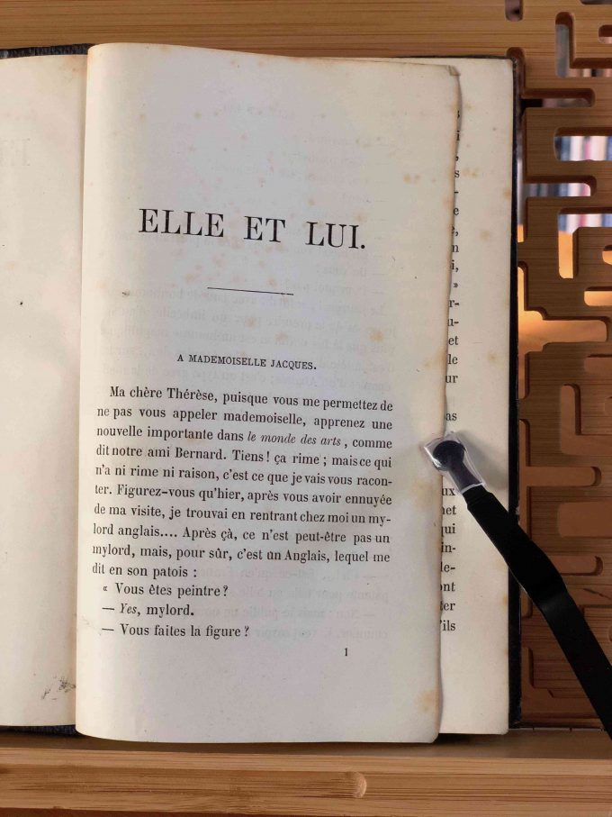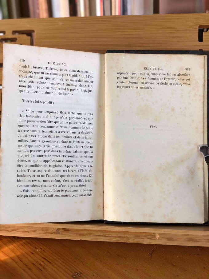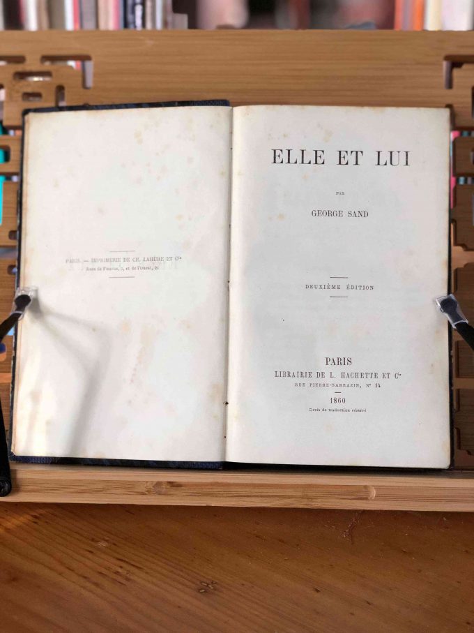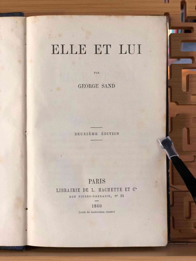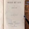 Elle et lui est un roman écrit par George Sand, publié en 1860 par la Librairie De L. Hachette Et Cie à Paris. Ce volume de 311 pages est en excellent état, avec une reliure à un quart en tissu et papier. Il s’agit de la deuxième édition de ce livre. Elle et lui raconte l’histoire tumultueuse d’une relation amoureuse, inspirée par l’histoire réelle de George Sand avec l’écrivain Alfred de Musset. À travers ce roman, Sand explore les thèmes de l’amour, de la passion, et des conflits émotionnels, en offrant une introspection profonde et nuancée des dynamiques de couple.