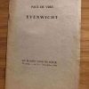 Paul De Vree’s “Evenwicht” werd gepubliceerd in 1941 door De Bladen voor de Poëzie in Mechelen. Deze eerste editie, bestaande uit 12 pagina’s, maakt deel uit van de reeks “De Bladen voor de Poëzie” en heeft een formaat van 15 cm bij 22,5 cm. Het boek is in uitstekende staat en heeft een zachte kaft met genaaide binding.