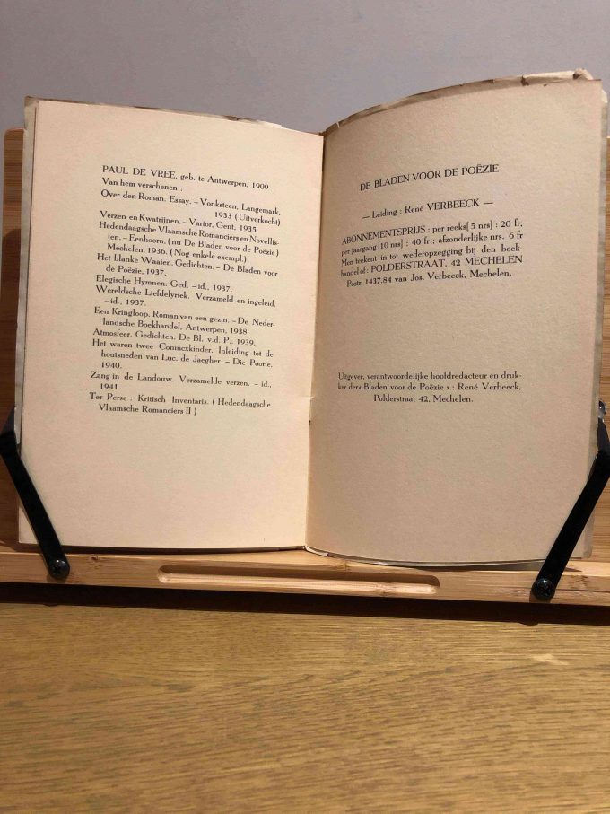 De Bladen voor de Poëzie was a literary magazine for poetry published from 1937 to 1995. The Flemish poet René Verbeeck was the publisher of the first series, which saw around seventy titles released from 1937 to 1944 by poets of that time, such as René Verbeeck himself, Paul De Vree, André Demedts, A.G. Christiaens, Jan Vercammen, Bert Peleman, and Albe. During World War II, the magazine faced issues due to paper shortages and in 1943 came under the control of the collaborating publisher Steenlandt (Brussels), eventually ceasing publication. In 1953, the magazine was restarted by Herman Van Fraechem, director of the Ursulinenklooster in Lier, and René Verbeeck joined the editorial committee.