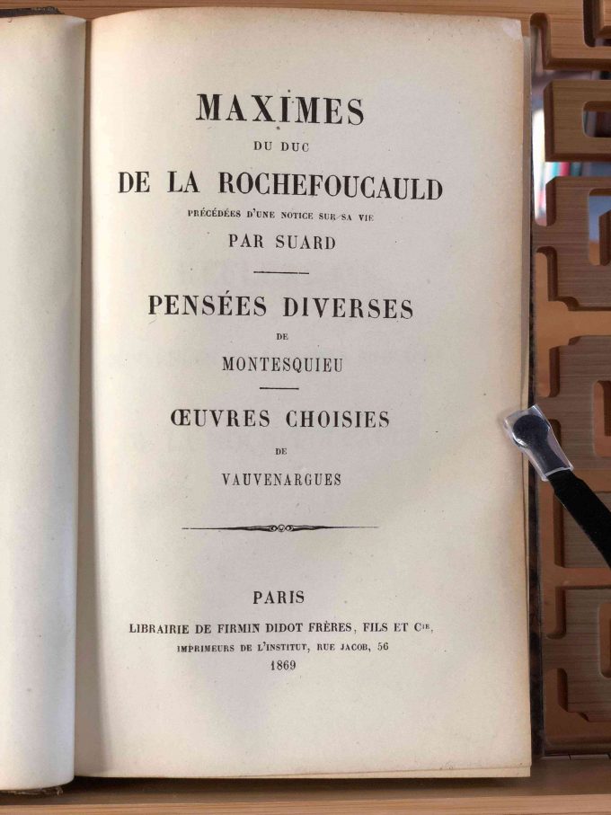 Maximes du Duc De La Rochefoucauld précédées d’une notice sur sa vie par Suard / Pensées Diverses de Montesquieu / Oeuvres Choisies de Vauvenargues is a collection published in 1869 by Librairie De Firmin Didot Frères, Fils Et Cie in Paris. This volume of 345 pages, including an eleven-page introduction, is in fine condition with quarter leather and paper binding. This edition includes the famous maxims of François de La Rochefoucauld, accompanied by a biographical note by Suard, the various thoughts of Montesquieu, and a selection of the works of Vauvenargues.