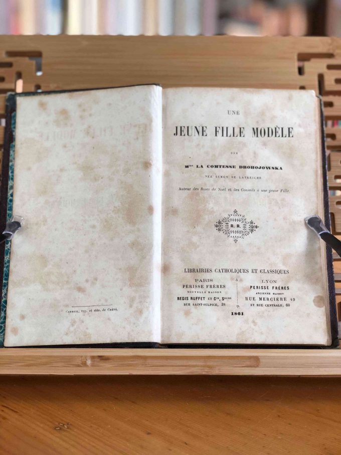 Une Jeune Fille Modèle is a novel written by Antoinette-Joséphine-Anne Drohojowska, also known as Countess Drohojowska, née Symon De Latreiche. Published in 1861 by Perisse Frères in Paris and Lyon, this work is part of the “Librairies Catholiques et Classiques” series and is considered a rare first edition. The book comprises 269 pages and is in fine condition, featuring quarter leather and paper binding. Drohojowska, already known for her previous works Les Roses de Noël and Conseils à une jeune Fille, continues to explore moral and educational themes in Une Jeune Fille Modèle. The novel tells the story of a young girl who embodies the virtues and qualities idealized for a woman of her time. Through everyday situations and personal challenges, the narrative illustrates Christian values and social ideals of the period, offering both an edifying and inspiring read for young girls of that era.