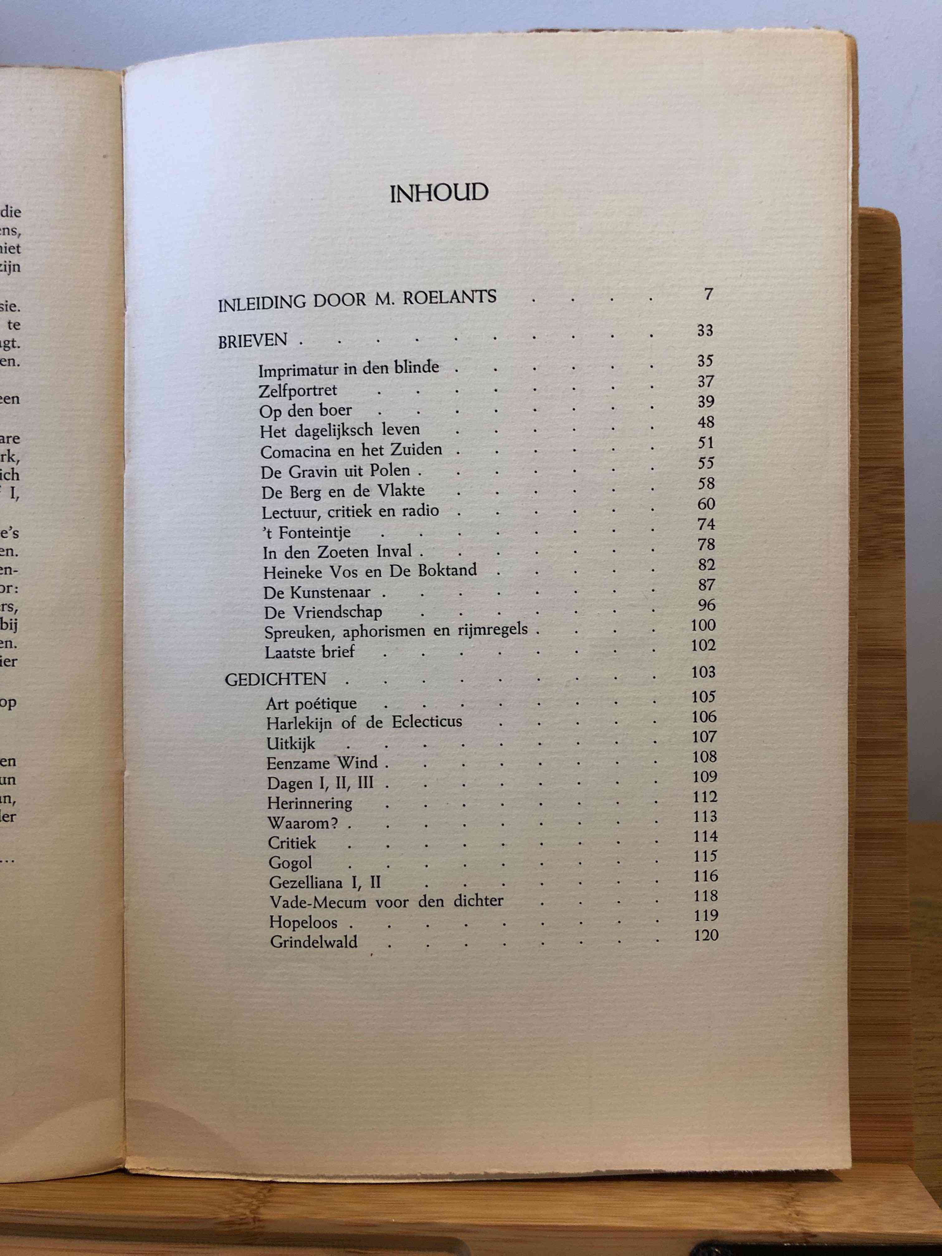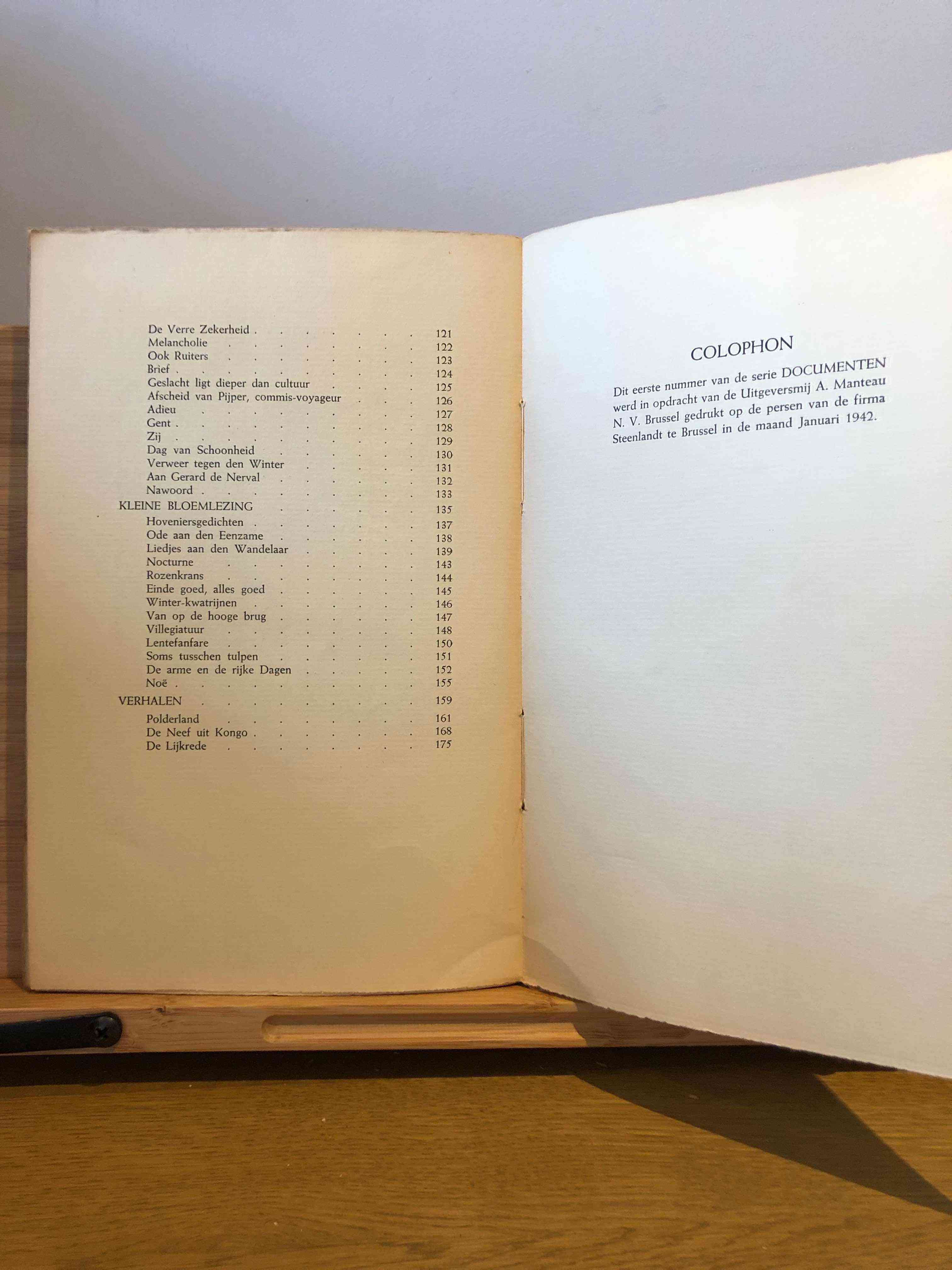 Wolfijzers en schietgeweren was the third book published under Richard Minne’s name, following the poetry collection In den zoeten inval (1926/1927) and the prose Heineke Vos en zijn biograaf (1933). The book was compiled by his best friend Raymond Herreman and Maurice Roelants. If it had been up to Minne himself, hardly any of his work would have been published during his lifetime. The collection includes a substantial foreword by Roelants, letter fragments, poems (including some from In den Zoeten Inval), and three stories. The quote at the beginning of this text comes from the introduction (Imprimatur in den blinde), in which Minne thanks the compilers – in whom he had placed blind trust – for their anthology.