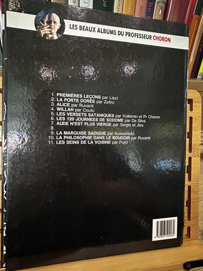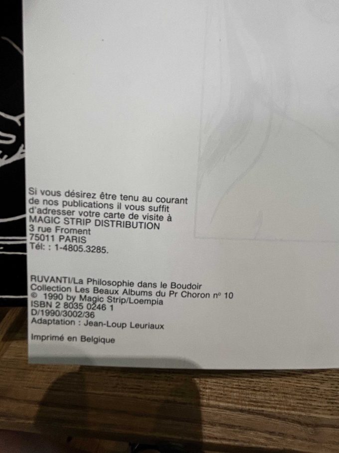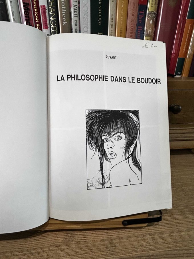 La philosophie dans le boudoir. d’après le Marquis de Sade is een grafische bewerking door Ruvanti, gebaseerd op het werk van de Markies de Sade. Deze editie werd in 1990 uitgegeven door Magic Strip/Loempia, Parijs, België. Het maakt deel uit van de serie “Les beaux albums du professeur Choron,” genummerd als het 10e deel. Het boek bevat [48] pagina’s en is uitgevoerd in hardcover met perfecte binding. Het verkeert in uitstekende staat.