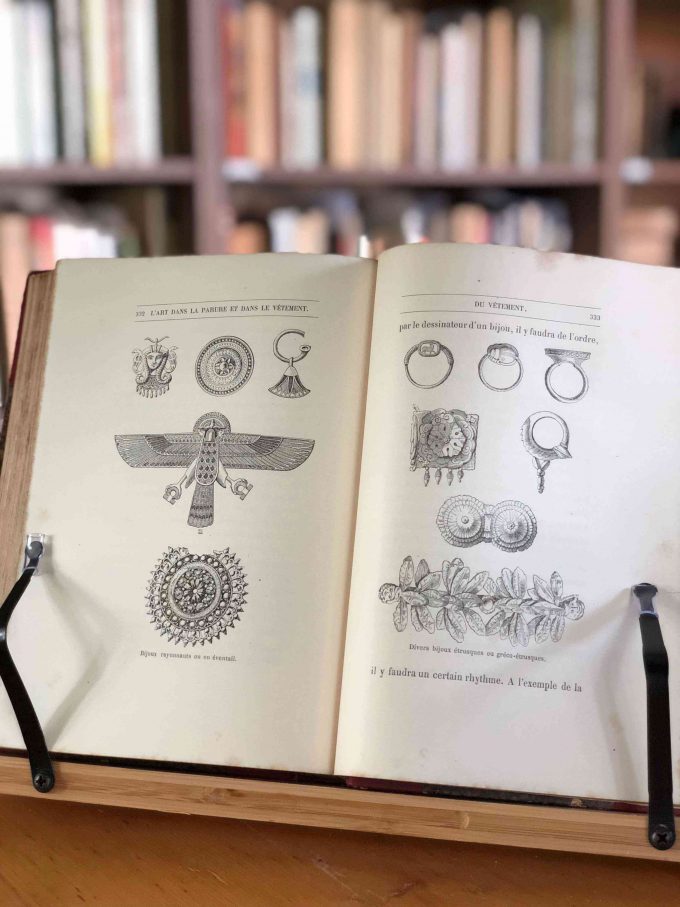 Blanc, Charles. L’art dans la parure et dans le vêtement. Paris: Renouard, 1875. 375 pages. 1 Volume. [First Edition], [First Impression]. One quarter binding (leather-paper). Sewn binding. Illustrations: Most of the illustrations depict male and female hairstyles, female attire and accessories (fans, parasols), laces, brooches, necklaces and other jewellery. Condition: Fine. Marbled front- and endpapers.