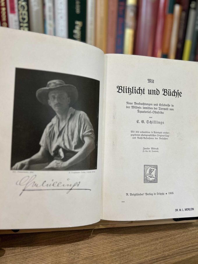 Carl Georg Schillings, born in 1865 in Münster, Germany, was a renowned explorer, photographer, and naturalist, best known for his expeditions to East Africa in the early 20th century. After studying law, Schillings developed a passion for exploration and hunting, leading him to undertake several expeditions in Africa. His contributions are particularly notable for introducing flash photography in wildlife observation, an innovation that allowed him to capture nighttime images of animals—an unprecedented feat at the time. His works, including Mit Blitzlicht und Büchse, not only provided valuable insights into African wildlife but also influenced conservation practices. Schillings played a crucial role in raising European public awareness about Africa’s natural wealth and the need to preserve it, long before conservation became a central concern.