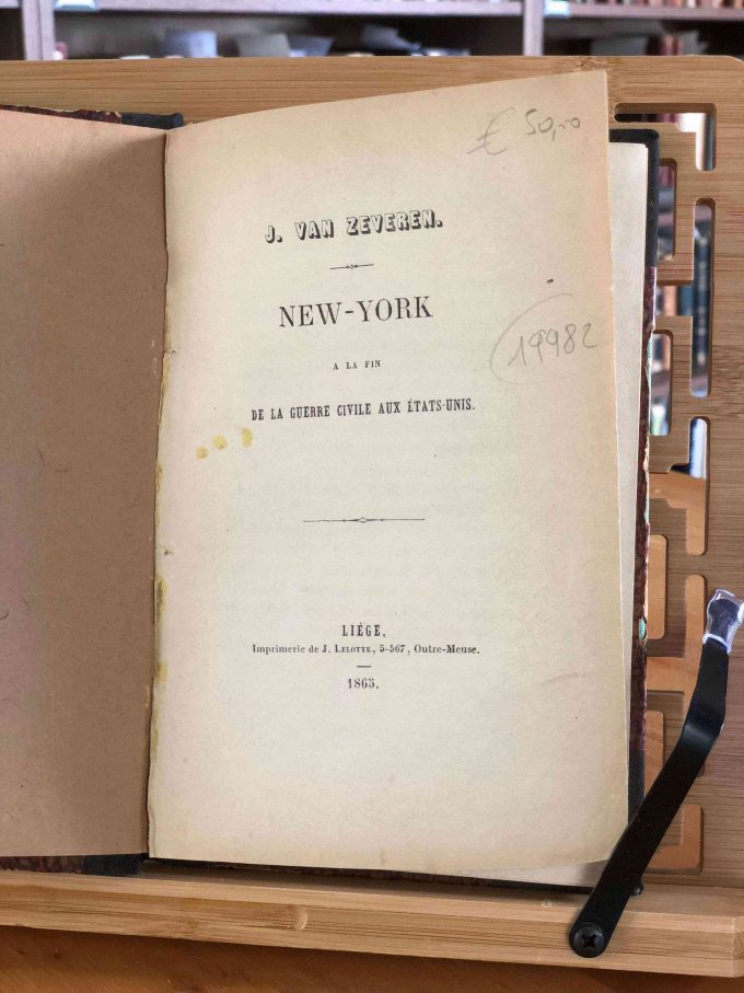 New-York A La Fin De La Guerre Civile Aux États-Unis by J. Van Zeveren is a book published in 1865 by J. Lelotte in Liège. The work comprises 207 pages and measures 21 cm. Although the edition is unknown, the book is in excellent condition and features a quarter faux leather-paper binding.