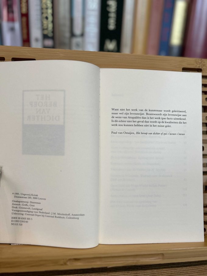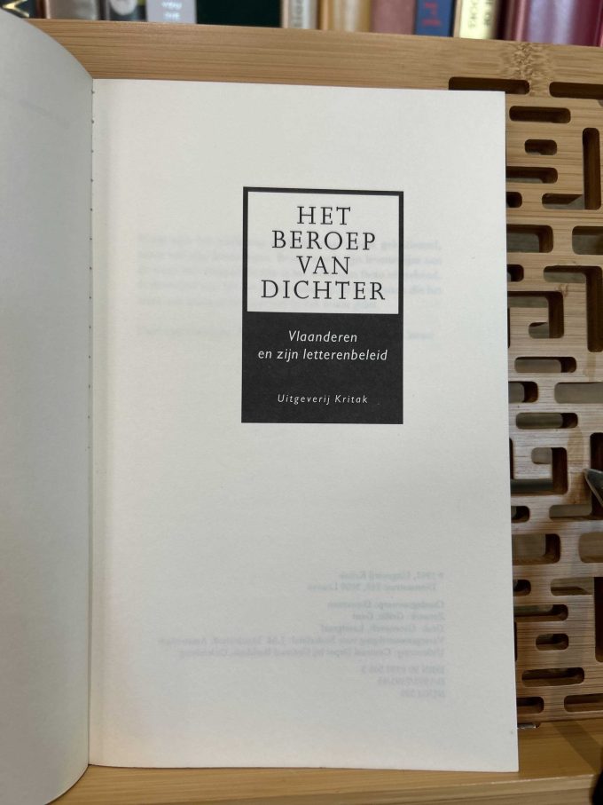 Beroep van dichter. Vlaanderen en zijn letterenbeleid (Profession of the Poet: Flanders and its Literary Policy) is a collection of essays compiled by a group of Flemish writers, including Paul de Wispelaere, Dirk van Bastelaere, Pol Hoste, Marc Reynebeau, Carlo van Baelen, Erik Spinoy, Guido van Heulendonk, Jan H. Mysjkin, Herman de Coninck, and Jozef Deleu. Published in 1993 by Kritak, this book discusses literary policy in Flanders, focusing on the challenges and opportunities faced by writers and poets in the region.