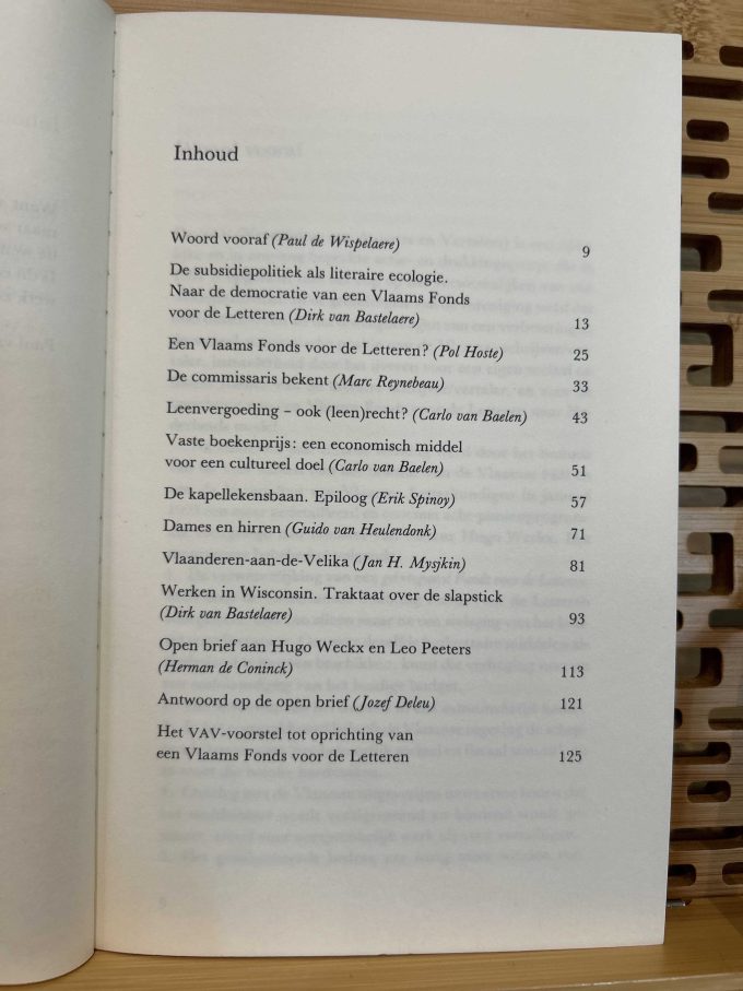 De essays bieden kritische perspectieven op onderwerpen zoals de rol van overheidssubsidies, de positie van Vlaamse literatuur op de internationale markt, en de dagelijkse realiteit van het leven als professionele schrijver of vertaler in Vlaanderen. Elk van de auteurs brengt zijn unieke invalshoek naar voren, gebaseerd op persoonlijke ervaring en observatie, waardoor het boek een veelzijdige kijk biedt op het literaire landschap in Vlaanderen​.