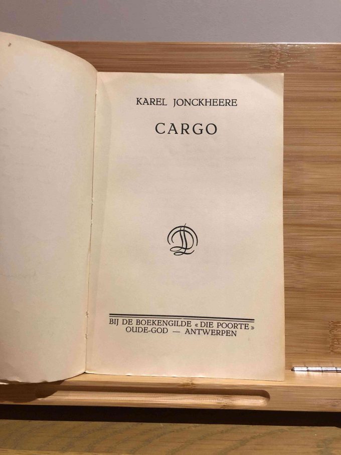 Jonckheere, Karel. Cargo. Antwerpen: Boekengilde Die Poorte, 1939-1940. 234 pages. 1 Volume. [First Edition]. 13 cm. x 20 cm. Softcover. Sewn binding. Signatures: Dedication from the Author to Paul Rogghé, who was a poet, author, journalist and historian: