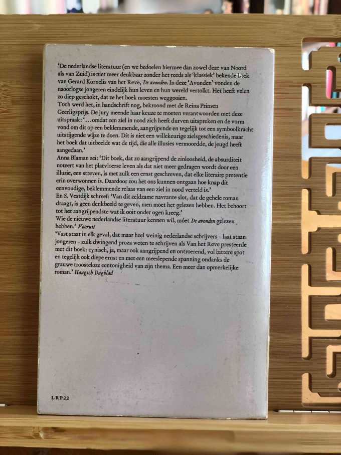 Upon its original publication in 1947, De avonden sparked considerable controversy, particularly due to its somber tone and focus on the emptiness of everyday life. Critics such as Godfried Bomans expressed concern about the potential impact of the novel on readers’ mental health. Bomans remarked that he feared for Reve’s mental health if this “condition” persisted for long. Nonetheless, the novel has since been praised by many as a masterpiece that accurately and honestly captures the bleakness of the post-war period.