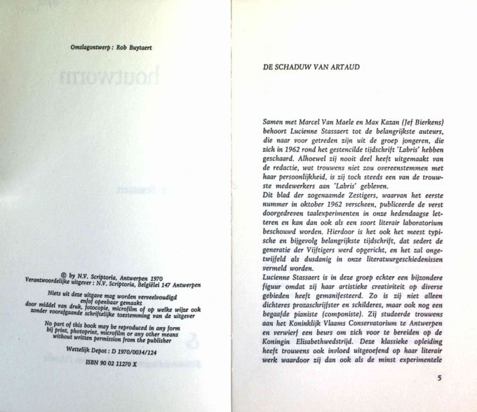 De Houtworm (The Woodworm) by Lucienne Stassaert is a book published in 1970 by Standaard in Antwerp and Utrecht. It is part of the series Standaard Literatuur Vandaag and is a first edition, consisting of 123 pages.