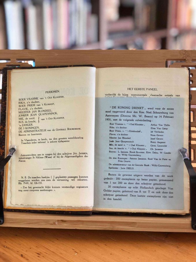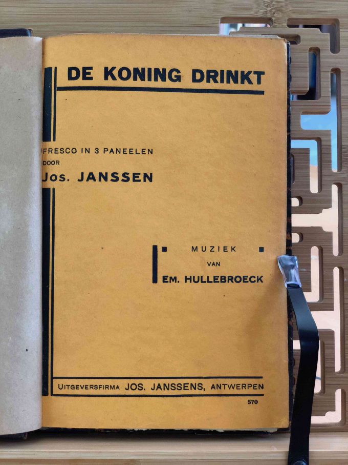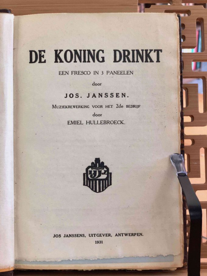 Janssen, Jos.. De koning drinkt. Fresco in 3 paneelen. Muziek van Em. Hullebroeck. Antwerpen: Jos. Janssens, 1931. [?p.] 1 Volume. [First Edition]. One Quarter Binding (Leather-Paper). Sewn binding. Signatures: Association: Van harte aangeboden aan den Goeden Vriend Dr. Theo De Ronde. With writers signature.