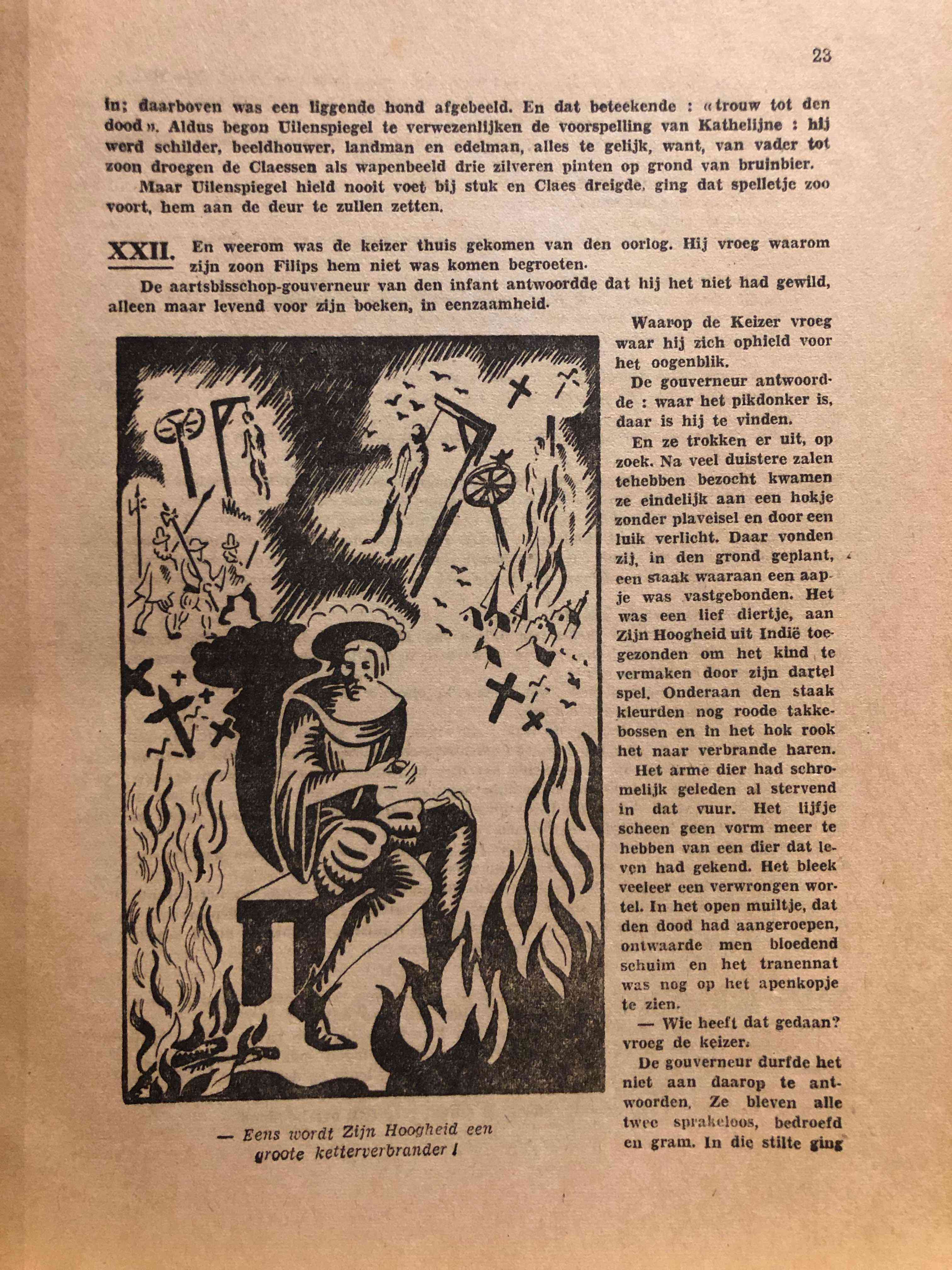 “The Legend of Uilenspiegel and Lamme Goedzak in Flanders and Elsewhere” is an adaptation of the famous story about the characters Tijl Uilenspiegel and Lamme Goedzak, written by A. Van Boeckxsel. This book, illustrated by Ch. Devaux and with a cover designed by M. Peetermans, was published by Het Laatste Nieuws in Brussels in 1943. The work is a rich narrative of the adventures of the legendary Flemish folk heroes Tijl Uilenspiegel and his loyal companion Lamme Goedzak, who travel through Flanders and other regions.
