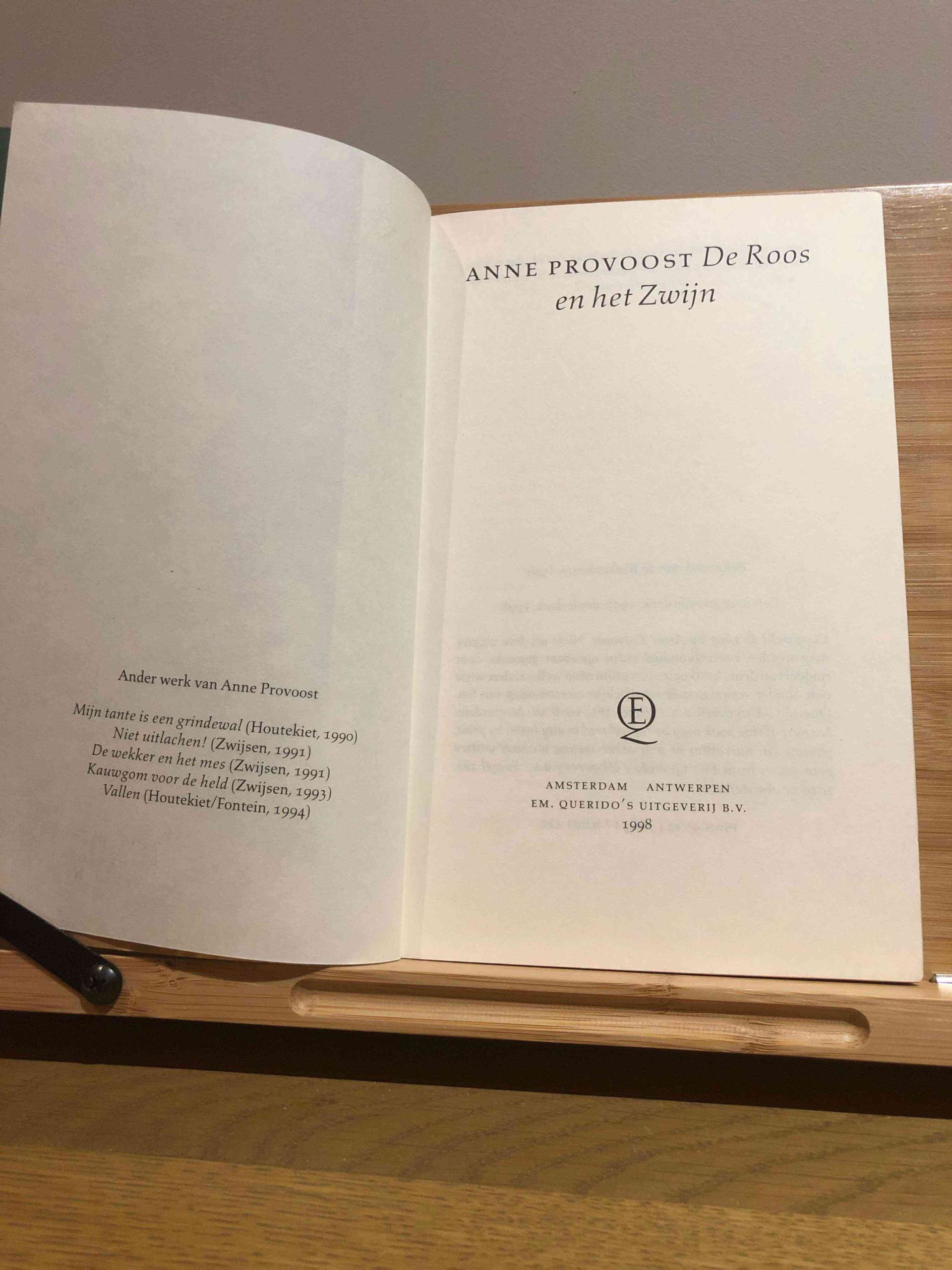 Provoost, Anne. De roos en het zwijn. Amsterdam / Antwerpen: Em. Querido, 1998. 109 pages. 1 Volume. Third Edition. 21,5 cm. x 13,5 cm. Softcover. Sewn binding. Condition: Fine.