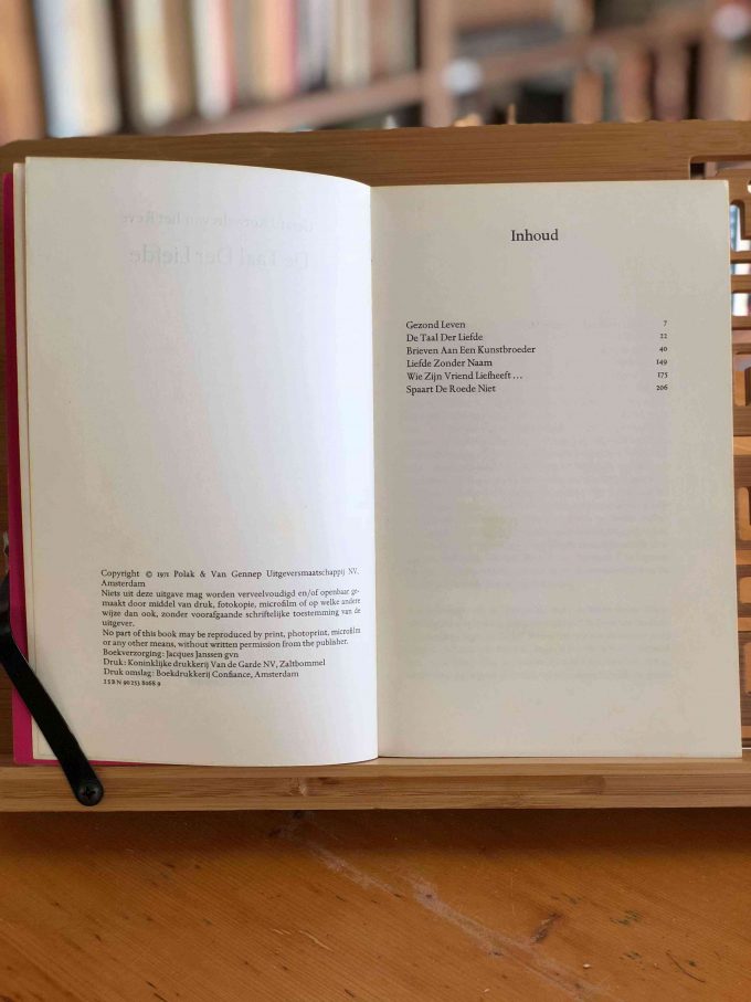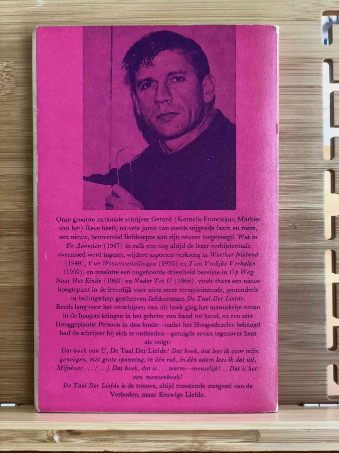 “De taal der liefde” (“The Language of Love”) is a reprint of Gerard Kornelis van Het Reve’s famous romance novel. Along with “Lieve Jongens” (“Dear Boys”), it forms a larger narrative but can also be read independently. In this novel, the first-person narrator tells exciting stories about adored boys to his lover. These are often fantasies, both highly romantic and sadomasochistic in nature. Additionally, Reve is a great humorist for whom seriousness can never exist without relativity, and humor never appears without tragedy. This edition also includes the “Brieven aan een kunstbroeder” (“Letters to a Fellow Artist,” letters to Carmiggelt, 120 pages).