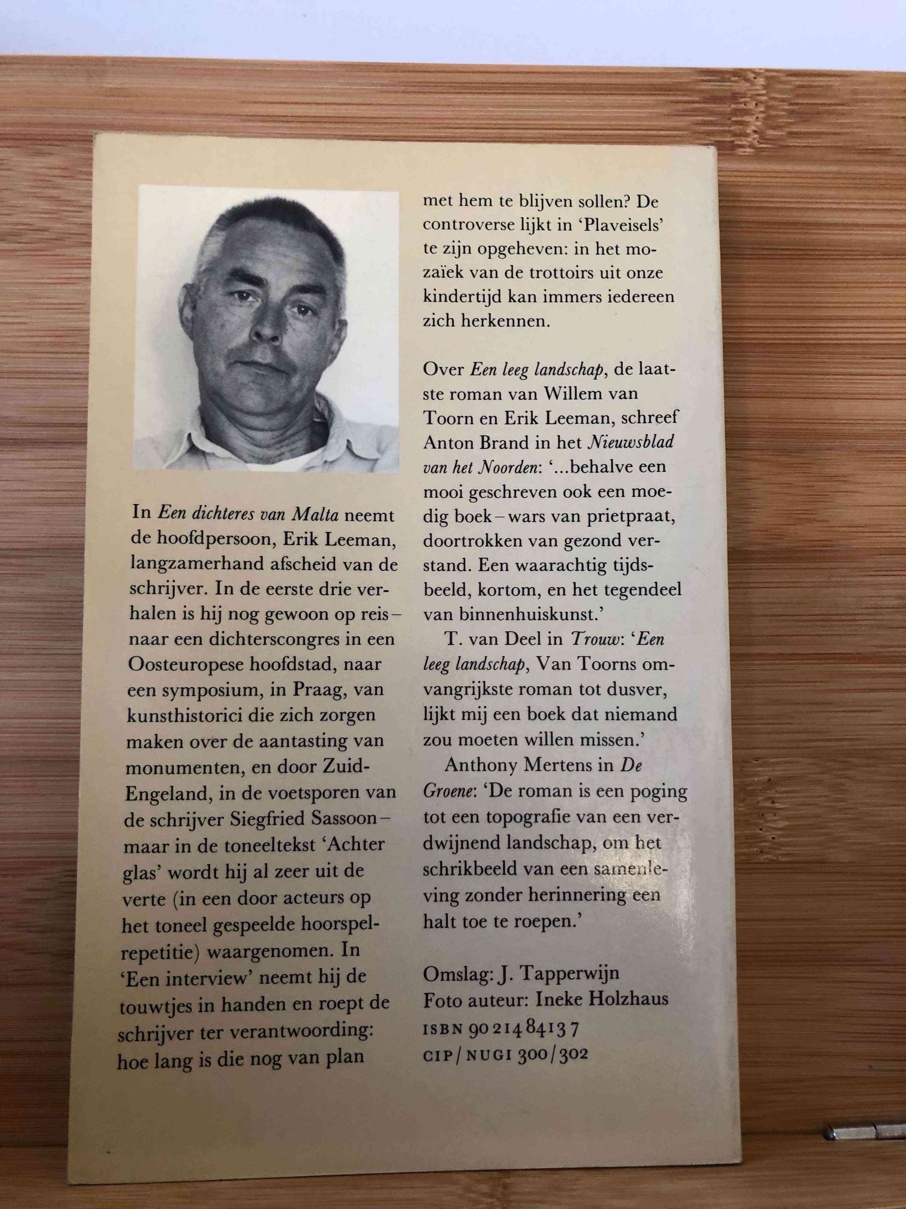 In this collection, Van Toorn bids farewell to his protagonist Erik Leeman. The first three stories are travel narratives about a poetry congress in Eastern Europe, a symposium in Prague, and a journey through England. In the story “An Interview,” Leeman asks the writer to account for how he has been treated, expressing a form of resistance against the author. The final story, “Pavements,” seems to resolve this resistance, with the writer returning to his childhood, living close to the earth and the pavement that confines it.