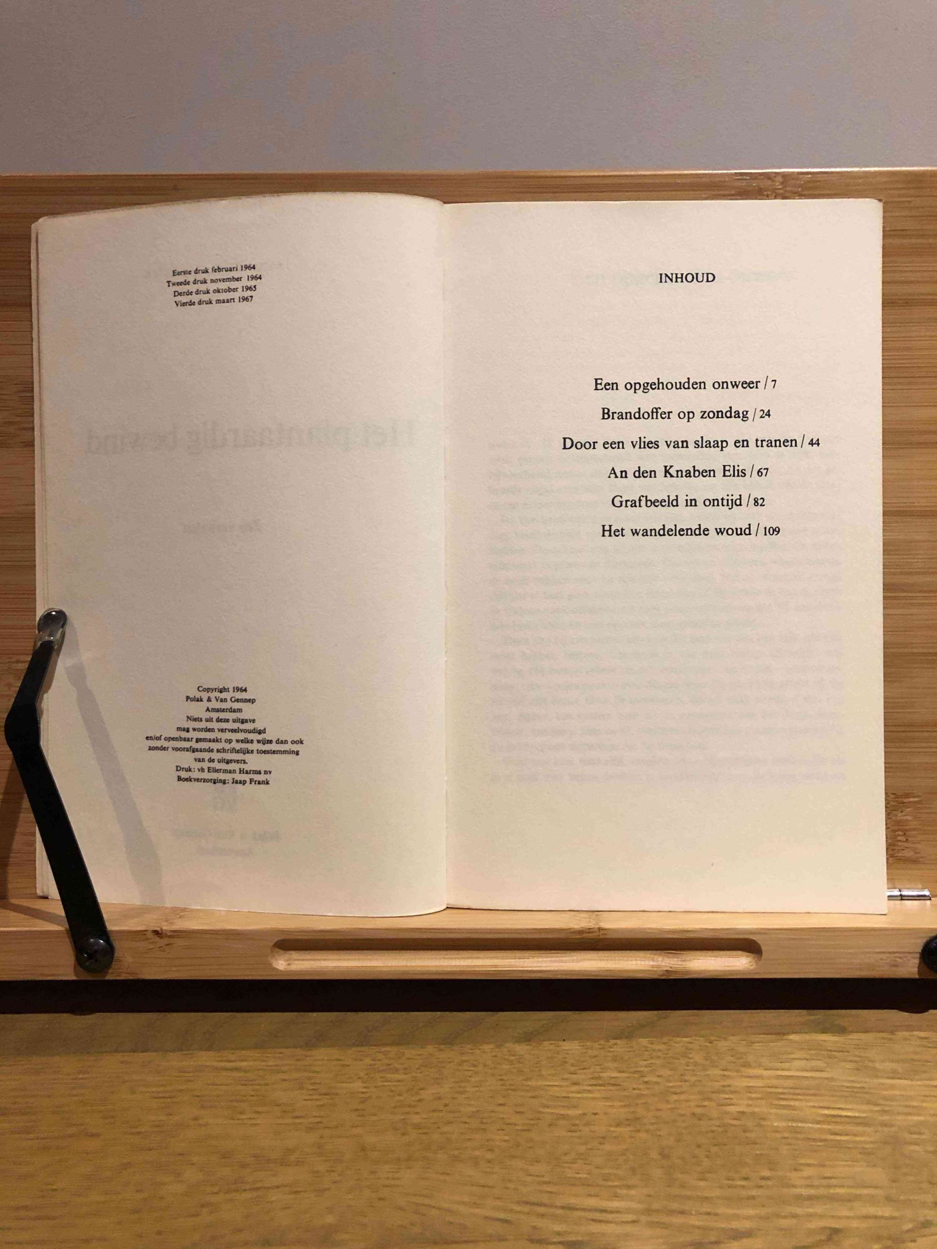“Het wandelende woud” (“The Walking Forest”) follows Josias Mure, a former constable, who questions whether he is awake or dreaming. He encounters bizarre events, such as a pine tree he planted that stands on the path one morning. In his dream, the forest begins to walk, and Mure eventually transforms into a tree. This story blurs the perception of reality and dream, keeping the reader questioning what is real.