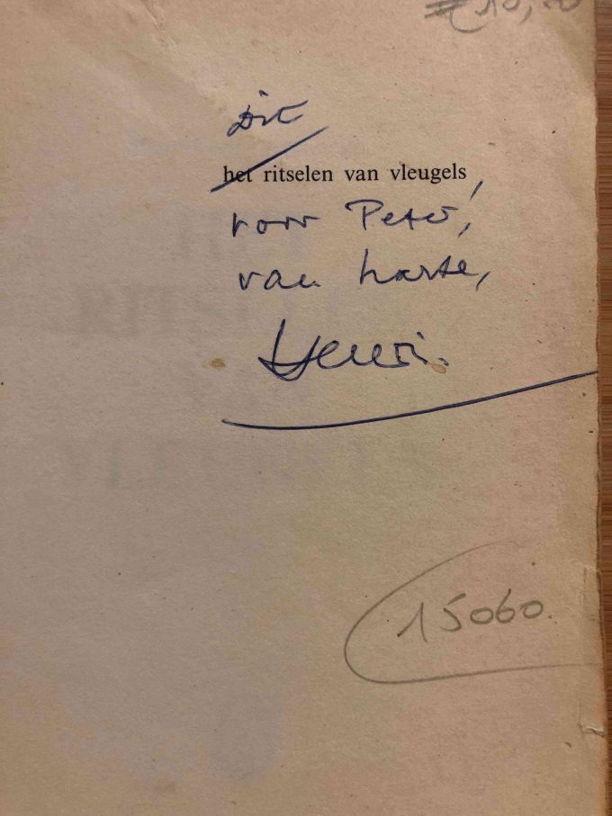 Het ritselen van vleugels by Henri-Floris Jespers, published in Antwerp by Soethoudt in 1979, consists of 196 pages. This is the first edition and the book is in good condition with a sewn softcover. This copy is signed by the author with the dedication “voor Peter, van harte, Henri”. The author has also crossed out part of the word “het” in the title and replaced it with “Dit”.