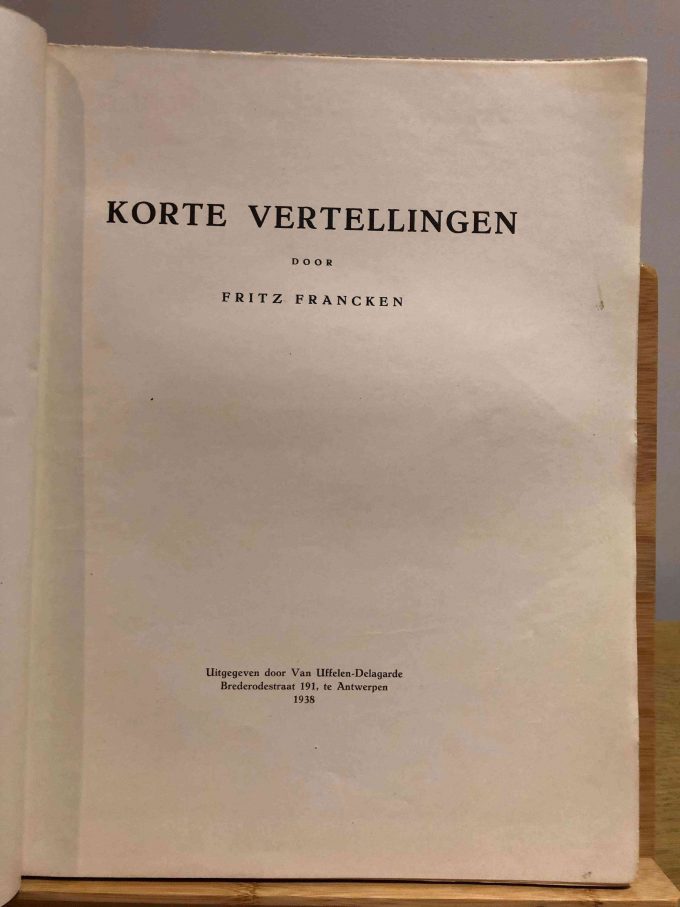 Francken, Fritz. Korte Vertellingen. Antwerpen: Van Uffelen-Delagarde, 1938. 350 pages. 1 Volume. [First Edition]. 22 cm. x 29 cm. Softcover. Sewn binding. Condition: Fine.