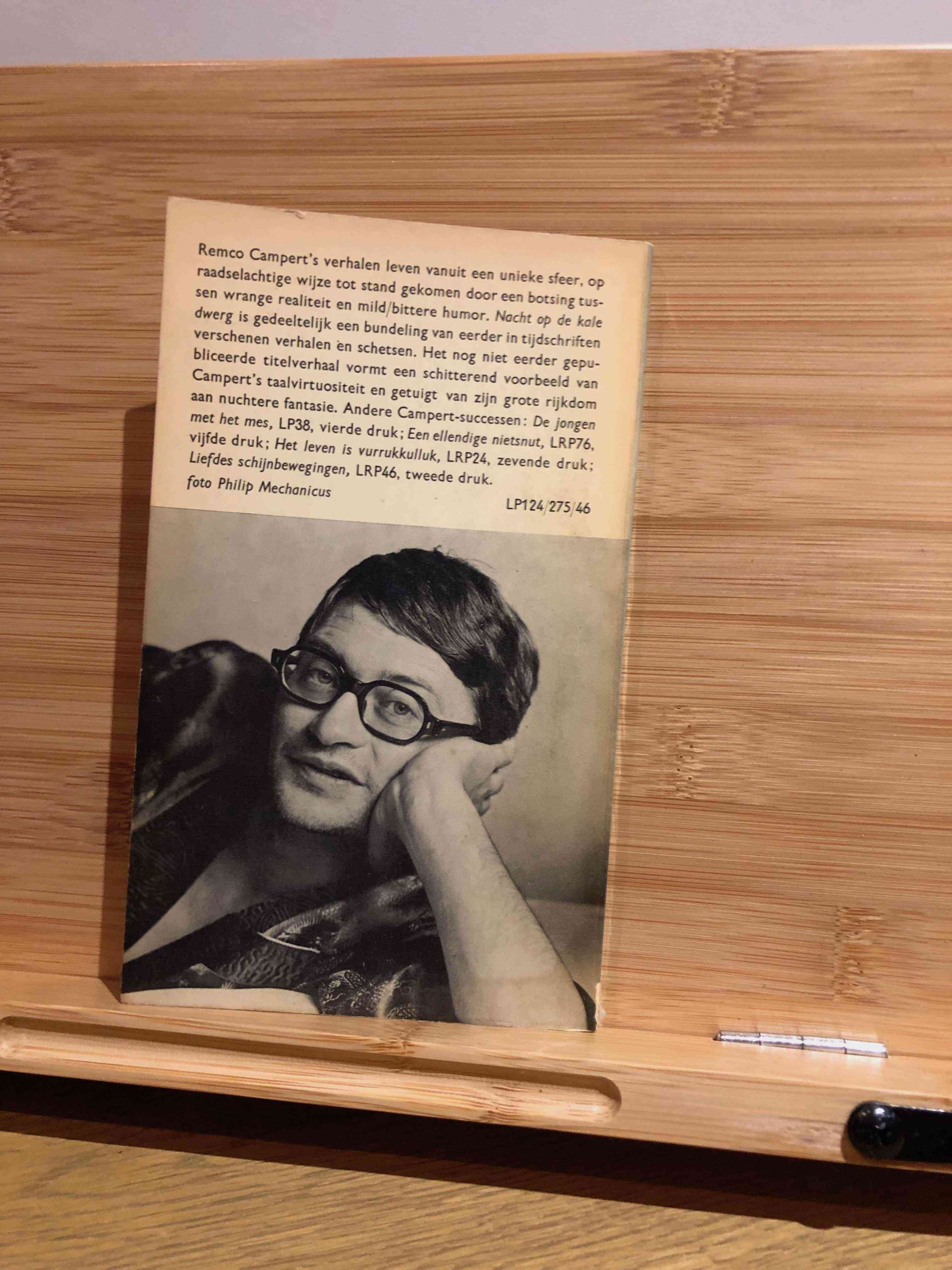 Nacht op de kale dwerg is een verhalenbundel van Remco Campert, gepubliceerd in 1964. Deze bundel valt binnen de serie Literaire Pocket en bevat verhalen die gekenmerkt worden door een combinatie van ironie en melancholie. Campert’s stijl in deze bundel is zowel ironisch als laconiek, maar de melancholie overheerst. Deze trieste berusting om alles wat mislukt is in het leven, geeft de verhalen hun kracht. De verhalen in deze bundel reflecteren vaak op de politieke en maatschappelijke kwesties van de tijd, wat typerend is voor Campert’s werk. Zijn stijl wordt niet door iedereen gewaardeerd, daar hij zijn ironie vaak breed uitmeet, maar juist deze melancholische ondertoon maakt zijn verhalen sterk en aangrijpend.
