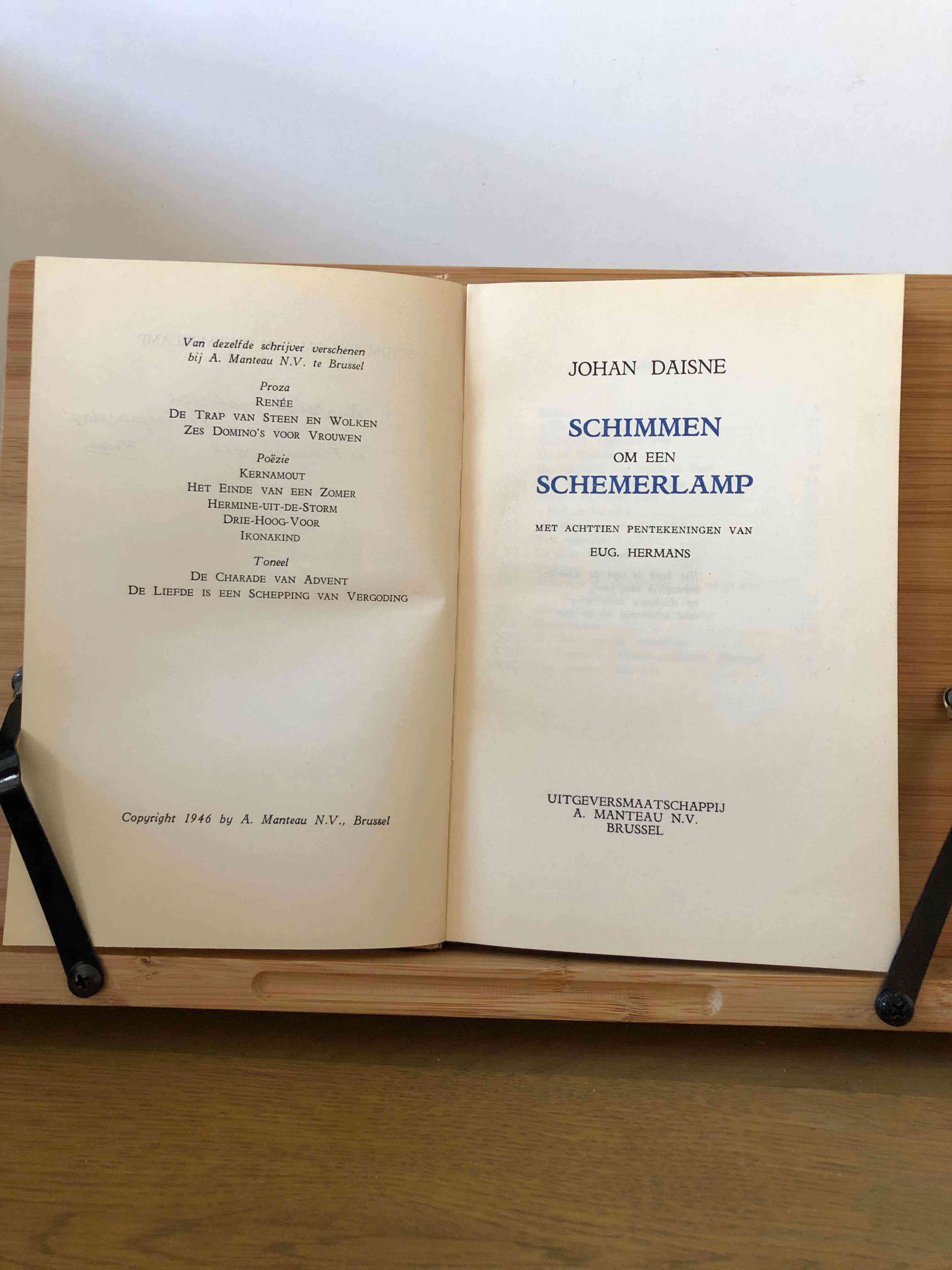 Schimmen om een schemerlamp door Johan Daisne is een fascinerende bundel die de lezer meeneemt in een wereld van mysterie en melancholie. Deze eerste editie, geïllustreerd met achttien pentekeningen van Eug. Hermans, biedt een unieke visuele aanvulling op de verhalen. Het boek werd in 1946 gepubliceerd door A. Manteau en is een uitstekend voorbeeld van Daisne’s vermogen om realiteit en verbeelding op een naadloze manier te verweven.