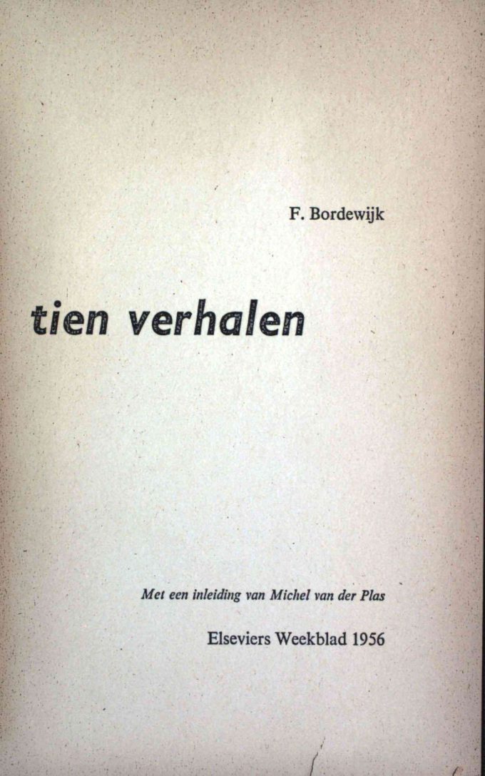 Tien verhalen door F. Bordewijk, gepubliceerd door Elseviers Weekblad in 1956, bevat 125 pagina’s en is de eerste editie. Dit boek is 12,5 cm x 20 cm groot en bevindt zich in een redelijk goede staat met een softcover en perfecte binding.