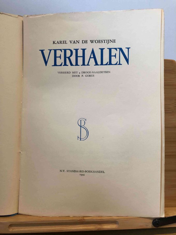 “Verhalen” is een verzameling verhalen van de Vlaamse schrijver Karel van de Woestijne, geïllustreerd door P. Gorus met vier droge-naaldetsen. Deze eerste editie werd gepubliceerd door Standaard-Boekhandel in 1944 en gedrukt door Erasmus in Gent. Het boek omvat 91 pagina’s en meet 19,5 cm x 27,5 cm. Het is uitgevoerd als een genaaide softcover en verkeert in uitstekende staat. Deze uitgave is gedrukt in een oplage van 1000 exemplaren, waarvan dit exemplaar nummer 931 is.