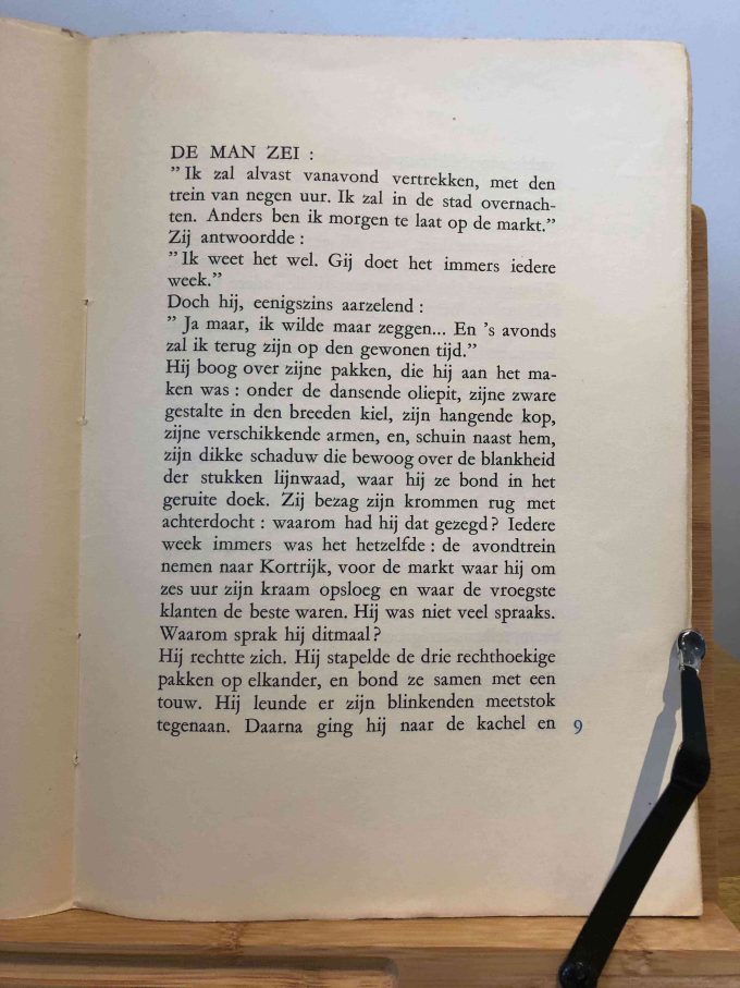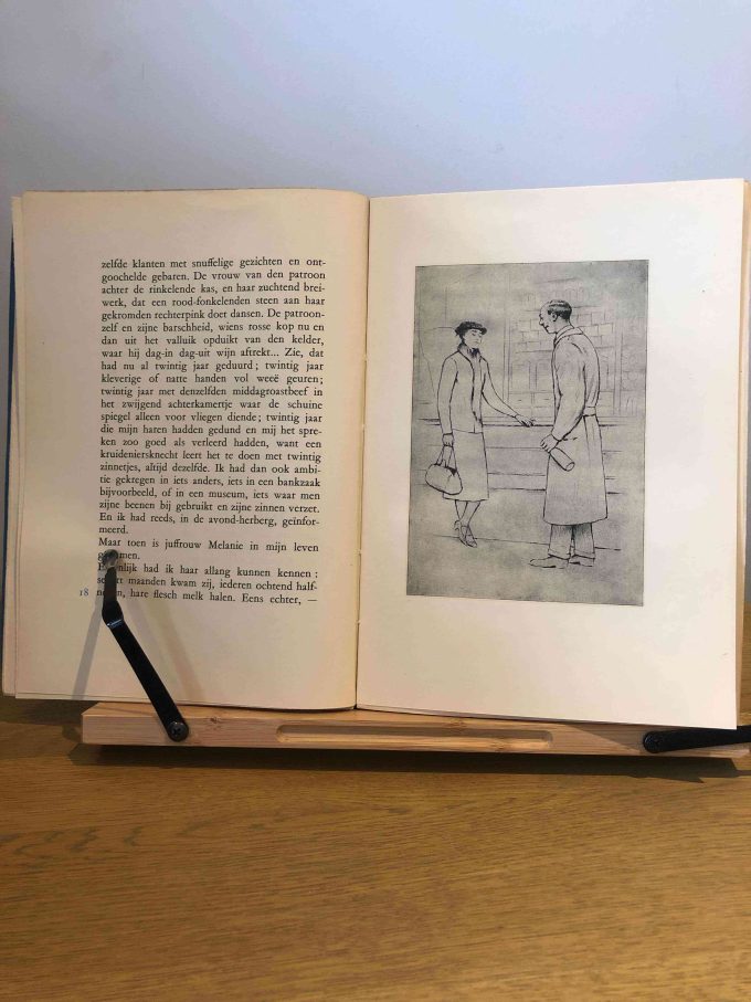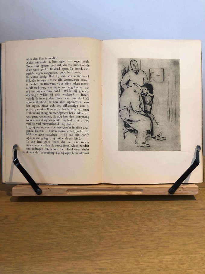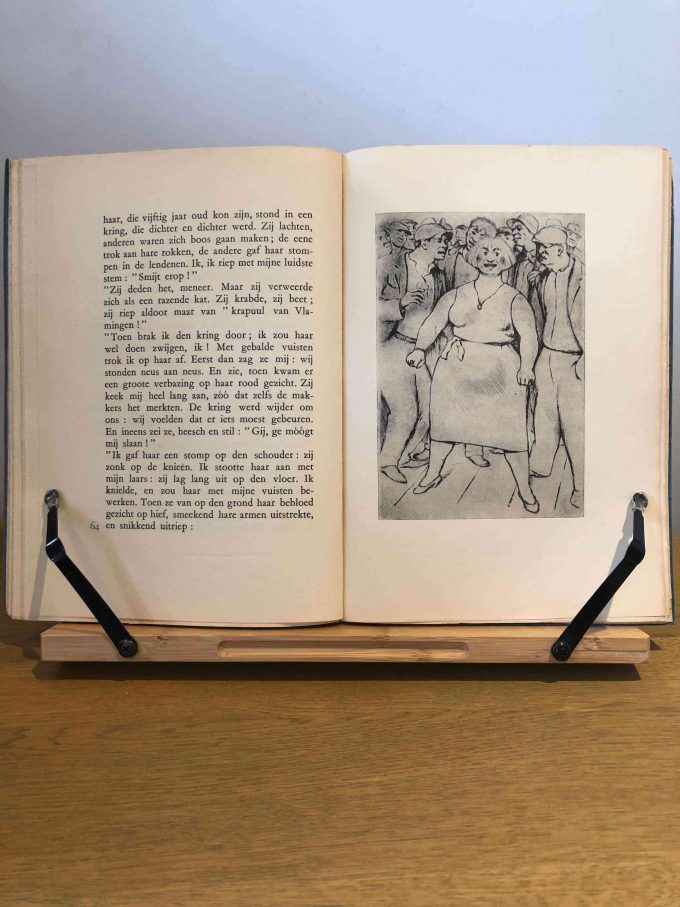 “Verhalen” (Stories) is a collection of stories by the Flemish writer Karel van de Woestijne, illustrated by P. Gorus with four drypoint etchings. This first edition was published by Standaard-Boekhandel in 1944 and printed by Erasmus in Ghent. The book comprises 91 pages and measures 19.5 cm x 27.5 cm. It is presented as a sewn softcover and is in fine condition. This edition was printed in a limited run of 1000 copies, with this particular copy being number 931.