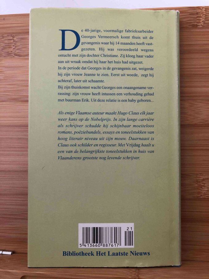 In Vrijdag van Hugo Claus, een toneelstuk dat zijn dramatische kracht toont, keert Georges Vermeersch terug naar huis na een gevangenisstraf wegens ontucht met zijn eigen dochter. Zijn thuiskomst wordt getekend door een verontrustende ontdekking: in zijn huis vindt hij een wieg met daarin een kind, het resultaat van een affaire tussen zijn vrouw Jeanne en zijn kaartvriend Erik tijdens zijn afwezigheid. Dit huiveringwekkende begin zet de toon voor een complexe verkenning van schuld, schaamte, en de diepgewortelde verlangens die menselijke relaties aantasten.