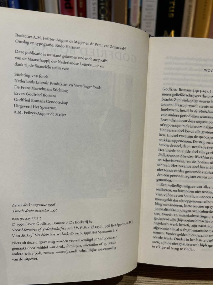 Werken I is a collection of works by Godfried Bomans, curated by Annemarie Feilzer and Peter van Zonneveld, published by De Boekerij in 1996. This volume presents a diverse selection of Bomans’ oeuvre, showcasing his talents across various literary genres, including short stories, essays, humorous narratives, and children’s literature. Notable works included in this collection are well-known short stories such as Erik of het klein insectenboek, a fantastical tale where a young boy enters a world inhabited by insects, and De Avonturen van Pa Pinkelman, a series of humorous and surreal stories following the escapades of an eccentric character.
