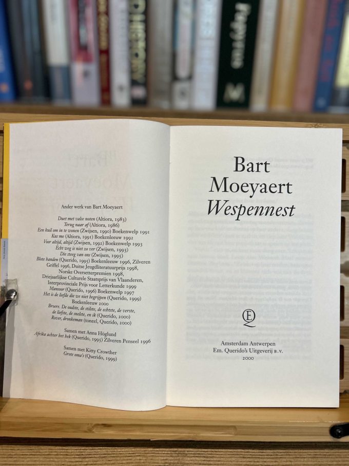 Moeyaert, Bart. Wespennest. Amsterdam Antwerpen: Em. Querido’s Uitgeverij B.V., 2000. 128 pages. 1 Volume. Fourth Edition. 21,5 cm. x 13,5 cm. Softcover. Perfect binding. Condition: Mint.