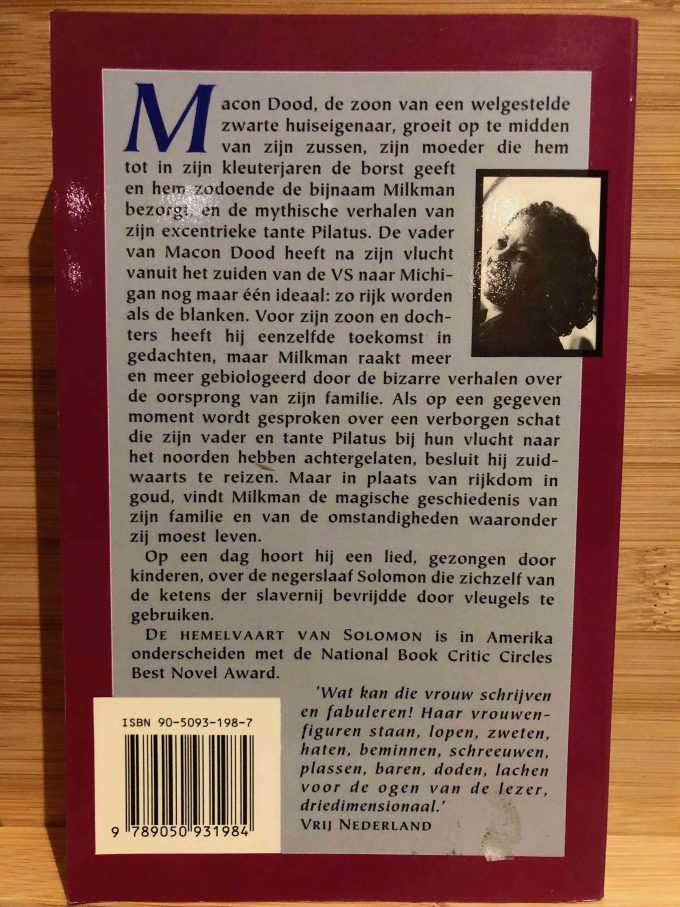 De hemelvaart van Solomon van Toni Morrison is een diepgaand en complex verhaal dat de lezer meeneemt op een reis door de Afro-Amerikaanse geschiedenis en cultuur. Met haar rijke en levendige proza weeft Morrison een verhaal dat zowel persoonlijk als universeel is, vol met symboliek en diepgaande thema’s zoals identiteit, erfgoed en zelfontdekking. De personages zijn levendig en gelaagd, en de verhaallijnen verweven zich op een manier die zowel ontroerend als verhelderend is. Morrison’s talent voor het creëren van een levendige en authentieke wereld maakt dit boek tot een onvergetelijke leeservaring.