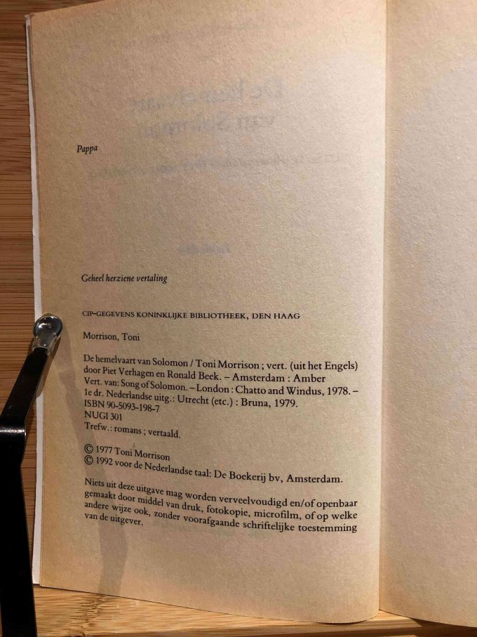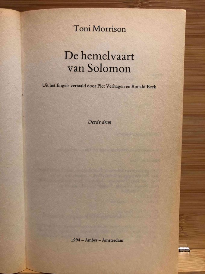 Morrison, Toni. [Translated by Verhagen, Piet – Beek, Ronald]. De hemelvaart van Solomon. (Original Title: Song of Solomon). Amsterdam: Amber, 1994. 333 pages. 1 Volume. Third Edition. 12 cm. x 19 cm. Softcover. Perfect binding. Condition: Fine.