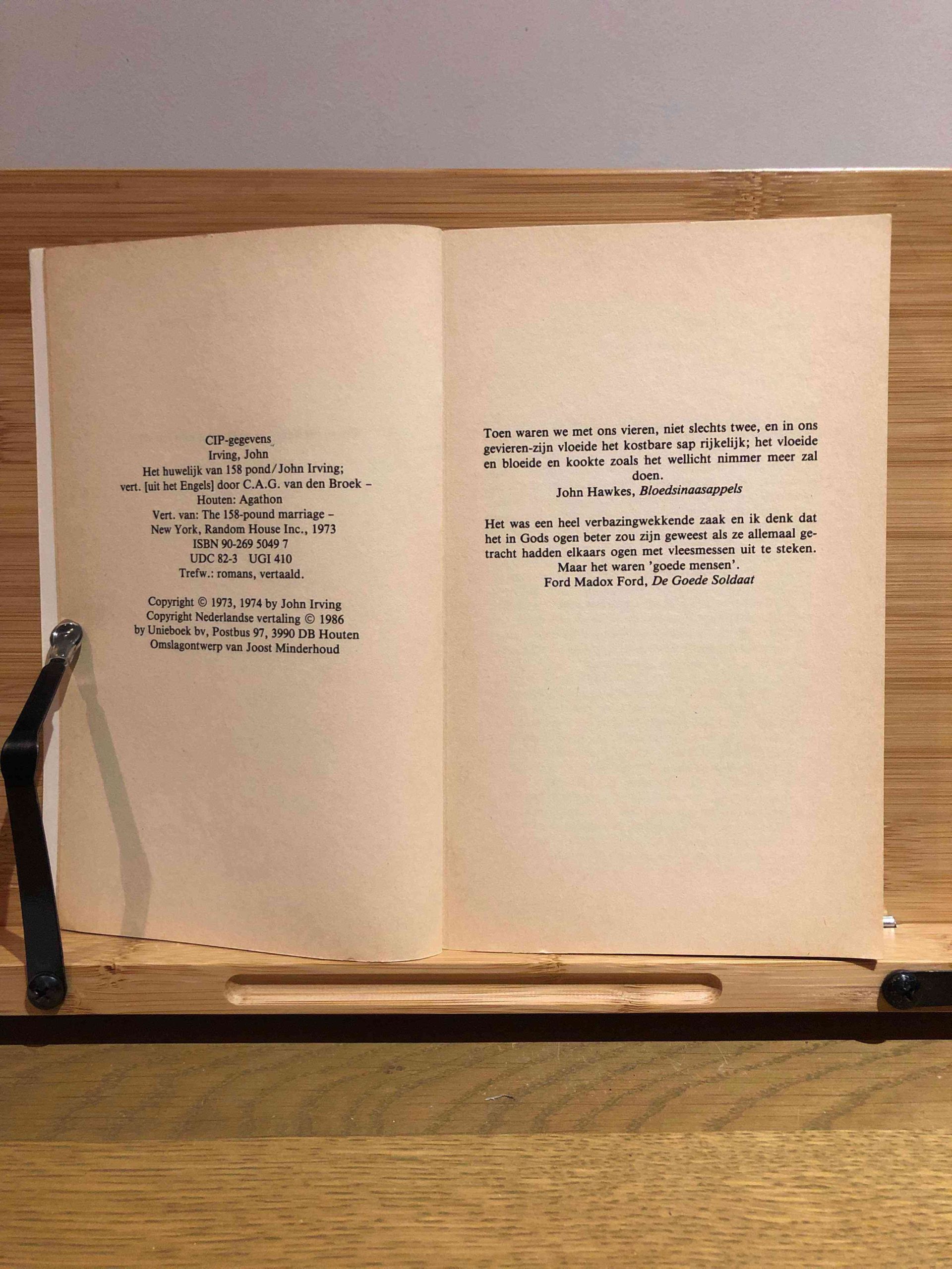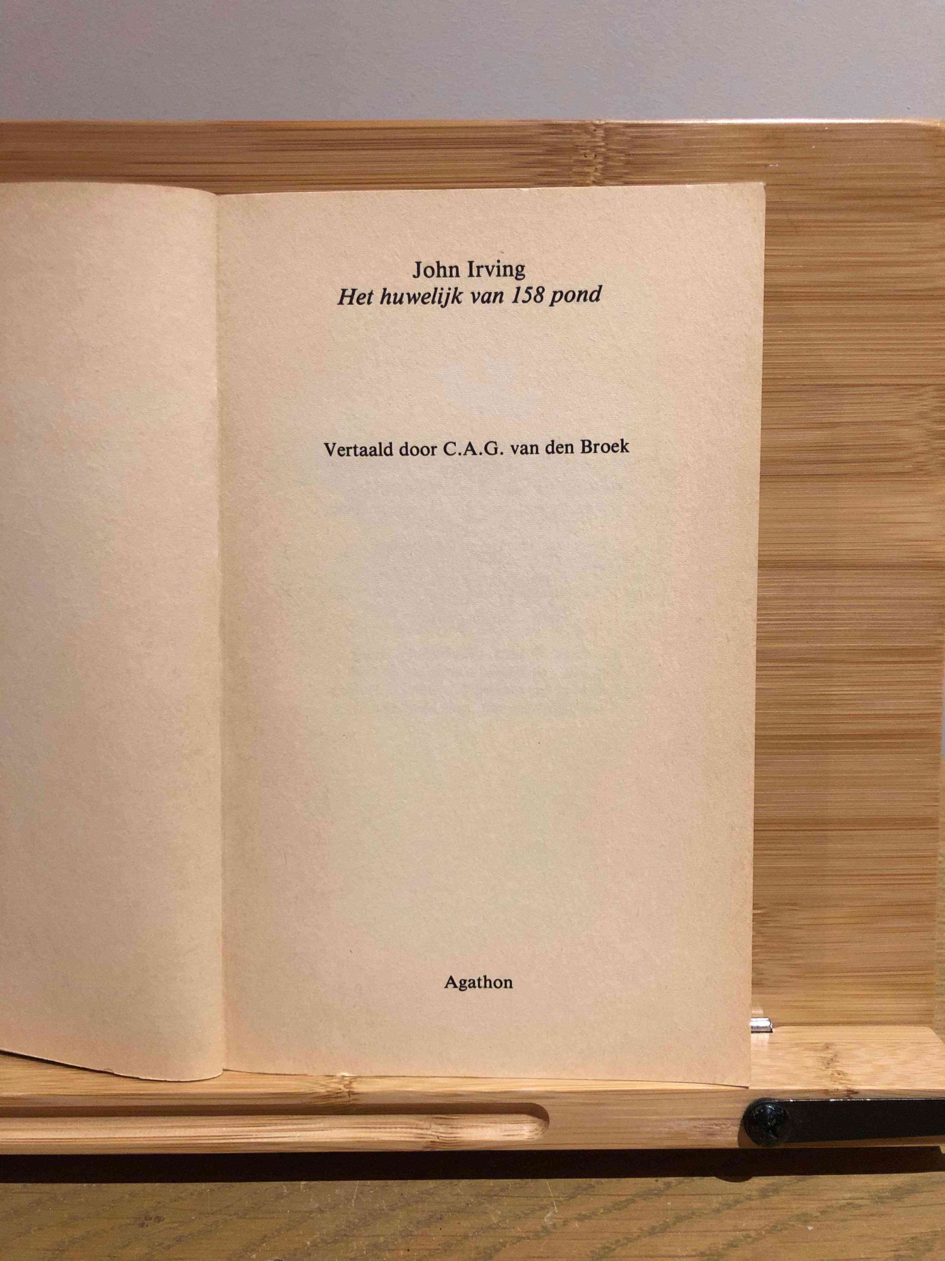 Irving, John. [Translated by van den Broek, C. A. G.]. Het huwelijk van 158 pond. (Original Title: The 158-pound marriage). Houten: Agathon, 1986. 247 pages. 1 Volume. First Dutch Language Edition. 12,5 cm. x 20 cm. Softcover. Perfect binding. Condition: Fine.