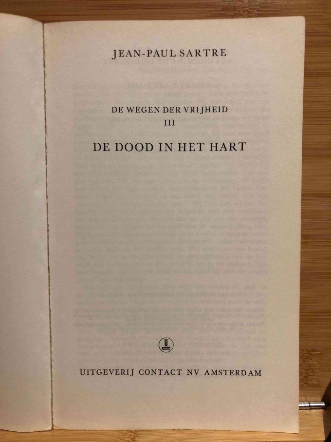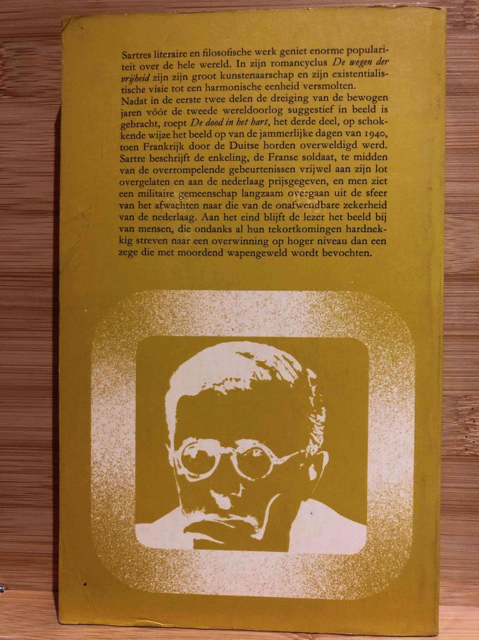 Sartres literaire en filosofische werk geniet enorme populariteit over de hele wereld. In zijn romancyclus “De wegen der vrijheid” zijn zijn groot kunstenaarschap en zijn existentialistische visie tot een harmonische eenheid versmolten. Nadat in de eerste twee delen de dreiging van de bewogen jaren voor de tweede wereldoorlog suggestief in beeld is gebracht, roept “De dood in het hart”, het derde deel, op schokkende wijze het beeld op van de jammerlijke dagen van 1940, toen Frankrijk door de Duitse horden overweldigd werd. Sartre beschrijft de enkeling, de Franse soldaat, te midden van de overrompelende gebeurtenissen vrijwel aan zijn lot overgelaten en aan de nederlaag prijsgegeven, en men ziet een militaire gemeenschap langzaam overgaan uit de sfeer van het afwachten naar die van de onafwendbare zekerheid van de nederlaag. Aan het eind blijft de lezer het beeld bij van mensen, die ondanks al hun tekortkomingen hardnekkig streven naar een overwinning op hoger niveau dan een zege die met moordend wapengeweld wordt bevochten.