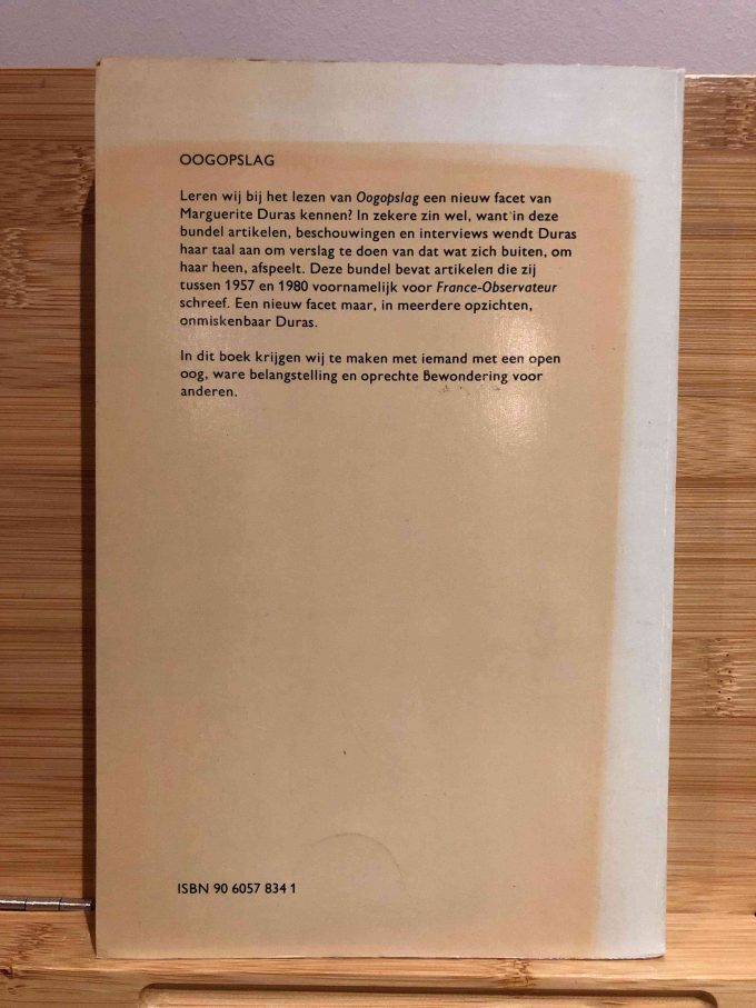 “Oogopslag. Journalistiek werk” is de Nederlandse vertaling van “Outside, papiers d’un jour” door Marguerite Duras, vertaald door Miep Veenis. Deze eerste Nederlandse editie werd uitgegeven door OmegaBoek in Amsterdam in 1990. Het boek omvat 252 pagina’s en meet 14 cm x 21,5 cm. Het is uitgevoerd als een softcover met perfecte binding en verkeert in uitstekende staat.