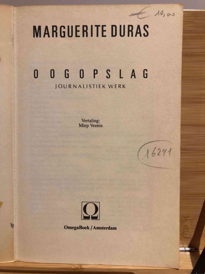 “Oogopslag. Journalistiek werk” (Glance. Journalistic Work) is the Dutch translation of “Outside, papiers d’un jour” by Marguerite Duras, translated by Miep Veenis. This first Dutch language edition was published by OmegaBoek in Amsterdam in 1990. The book comprises 252 pages and measures 14 cm x 21.5 cm. It is presented as a softcover with perfect binding and is in fine condition.