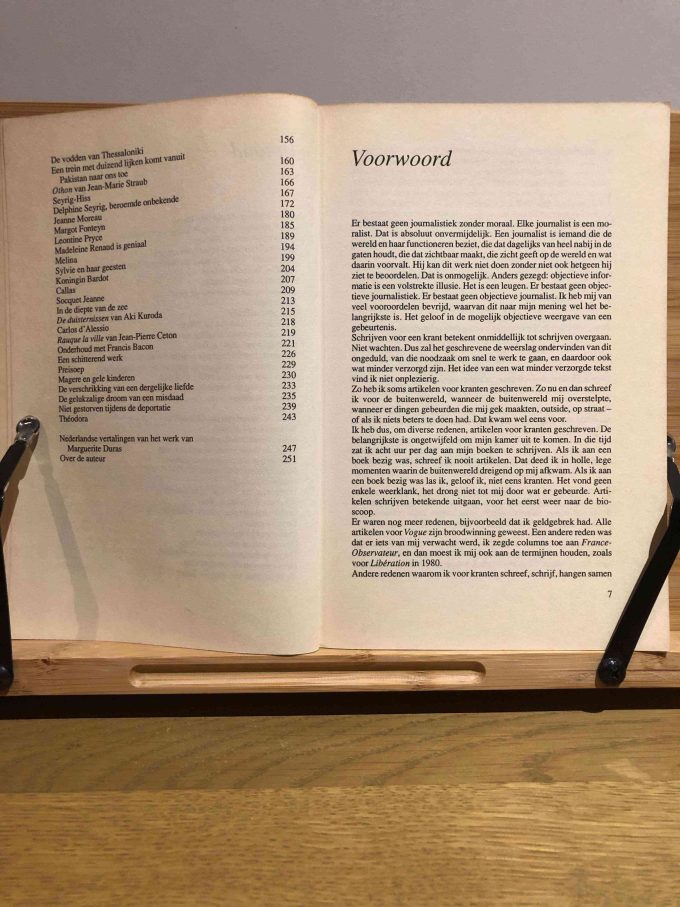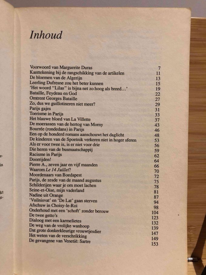Naast haar literaire werk heeft Marguerite Duras ook veel journalistieke teksten geschreven. Een zestigtal van deze teksten, oorspronkelijk gepubliceerd tussen 1957 en 1980 in uiteenlopende bladen als Le Monde, France-Observateur, Sorcières en Vogue, is nu gebundeld in dit boek. Deze verzameling demonstreert het brede scala van Duras’ mogelijkheden op het gebied van de journalistiek, variërend van geëxalteerd triviale portretten van kunstenaars in Vogue tot filosofische en maatschappelijk geëngageerde pleidooien in France-Observateur. Hoewel sommige stukken onvermijdelijk gedateerd zijn, blijven ze overal betekenisvol.