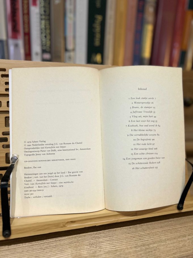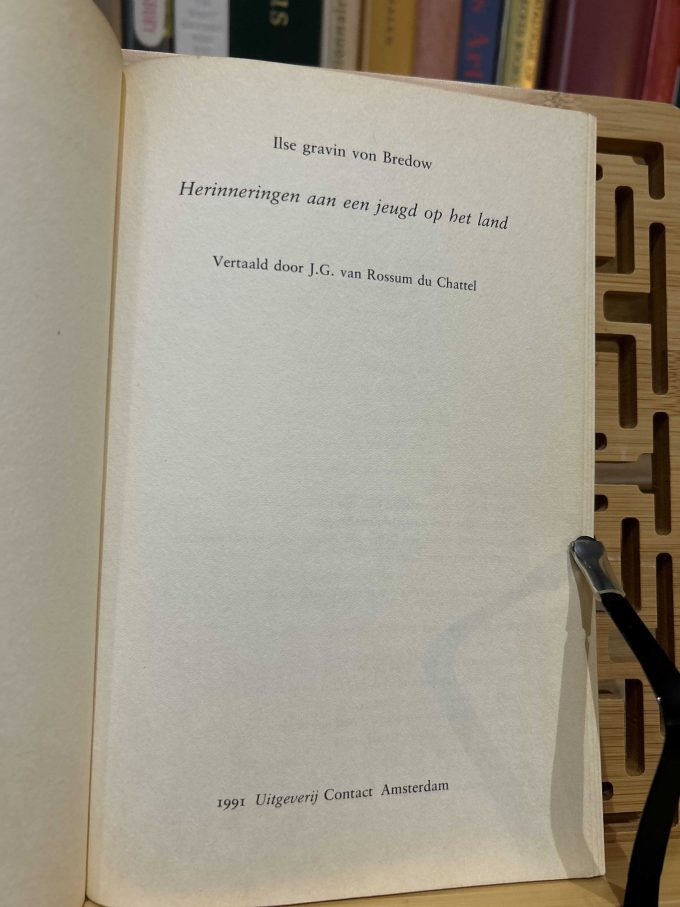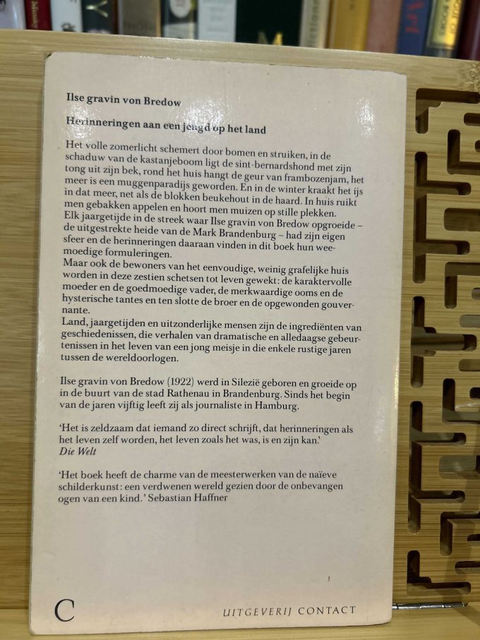 Herinneringen aan een jeugd op het land, traduit de l’allemand par J.G. van Rossum du Chattel, est l’édition néerlandaise du livre Kartoffeln mit Stippe de la comtesse Ilse von Bredow. Publié en 1991 à Amsterdam par Contact, ce livre est un récit mémoriel de l’enfance de l’auteure, centrée sur la vie à la campagne en Allemagne avant et pendant la Seconde Guerre mondiale. Von Bredow dépeint avec une tendresse teintée de nostalgie les expériences quotidiennes de la vie rurale, loin de l’agitation des grandes villes, où les traditions familiales et la simplicité de la vie de campagne occupaient une place centrale. Ce récit évoque également les difficultés de cette époque, mais toujours avec une touche d’humour et une certaine distance critique, propre à l’auteure. Les descriptions vivantes et les personnages attachants permettent aux lecteurs de s’immerger dans un monde révolu, où les valeurs de la terre et de la famille étaient prépondérantes. Ce livre offre un aperçu précieux des modes de vie d’une époque et d’un lieu souvent ignorés dans les récits historiques plus larges, apportant ainsi une perspective unique sur l’Allemagne rurale du début du XXe siècle.