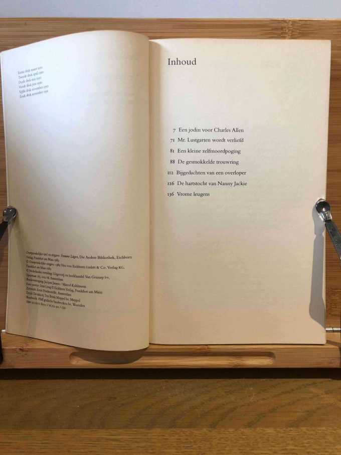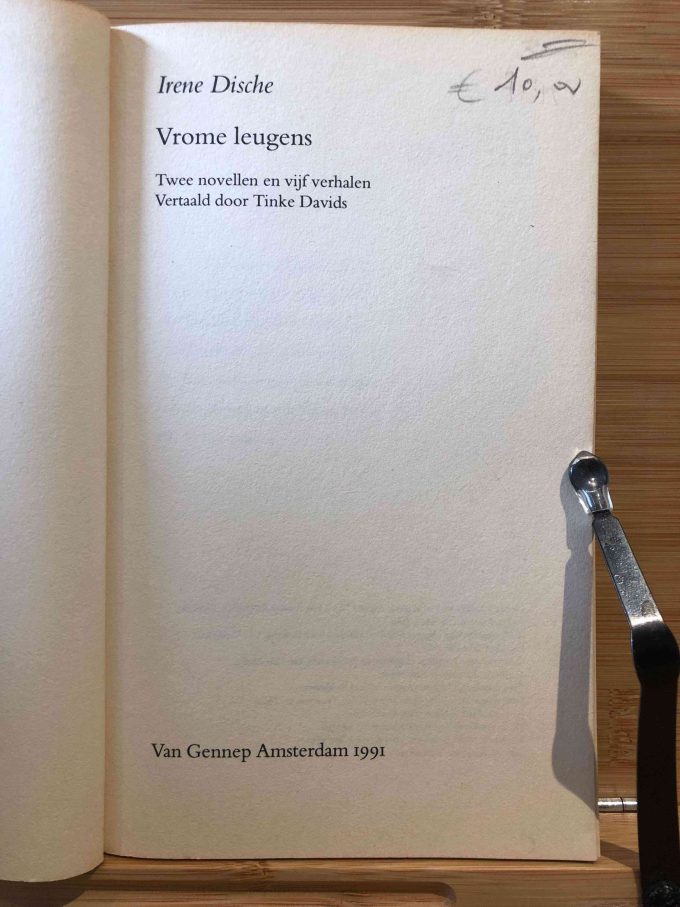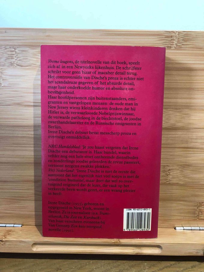 ‘Vrome leugens’ is een novelle die, samen met nog een andere novelle en vijf korte verhalen, is opgenomen in deze bundel van de in New York geboren en in West-Berlijn levende schrijfster. De hoofdpersonen in alle verhalen zijn eenzame buitenstaanders, joodse emigranten en vastgelopen figuren, vaak een mengeling van alles. Dische schrijft koel observerend, detaillistisch bij het bizarre en macabere af en met een zekere portie ondergrondse zwarte humor. Na de enthousiaste ontvangst van deze bundel in West-Duitsland zal hij ook hier lezers aanspreken, want gezien de inhoudelijke en literaire kwaliteiten is deze bundel zeer aan te bevelen.