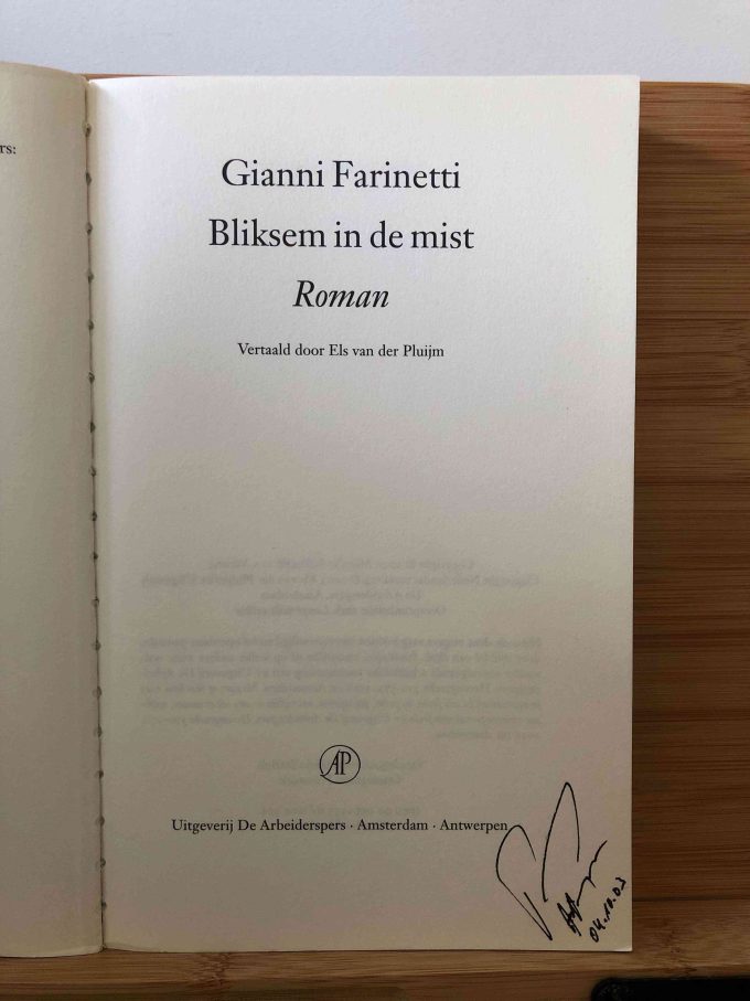 Farinetti, Gianni. [Translated by van der Pluijm, Els]. Bliksem in de mist. (Original Title: Lampi nella nebbia). Amsterdam / Antwerpen: De Arbeiderspers, 2003. 197 pages. 1 Volume. [First Dutch Language Edition]. 13,5 cm. x 21,5 cm. Softcover. Perfect binding. Condition: Fine.