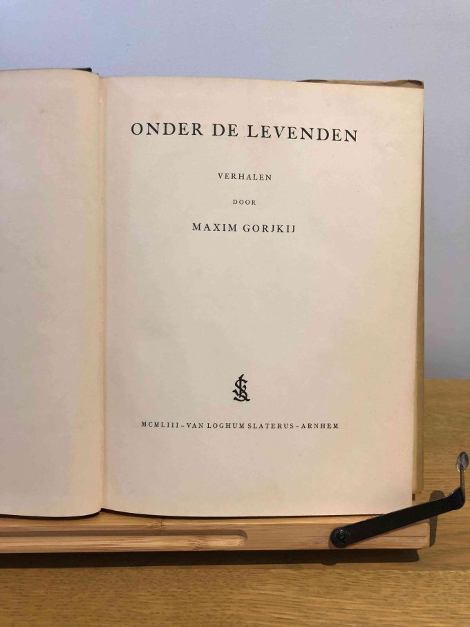 Gorjkij, Maksim – Gorki, Maksim. Onder de levenden. Verhalen. Arnhem: Van Lochum Slaterus, MCMLIII [1953]. 189 pages. 1 Volume. First Dutch Language Edition. 18 cm. x 24 cm. Hardcover with Dust Jacket. Sewn binding. Condition: Fine.