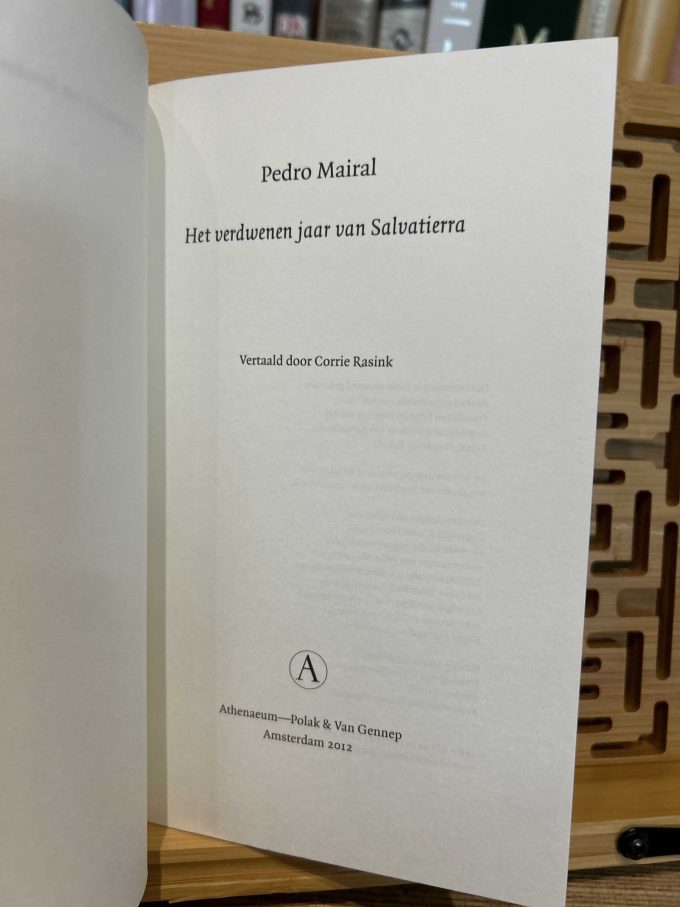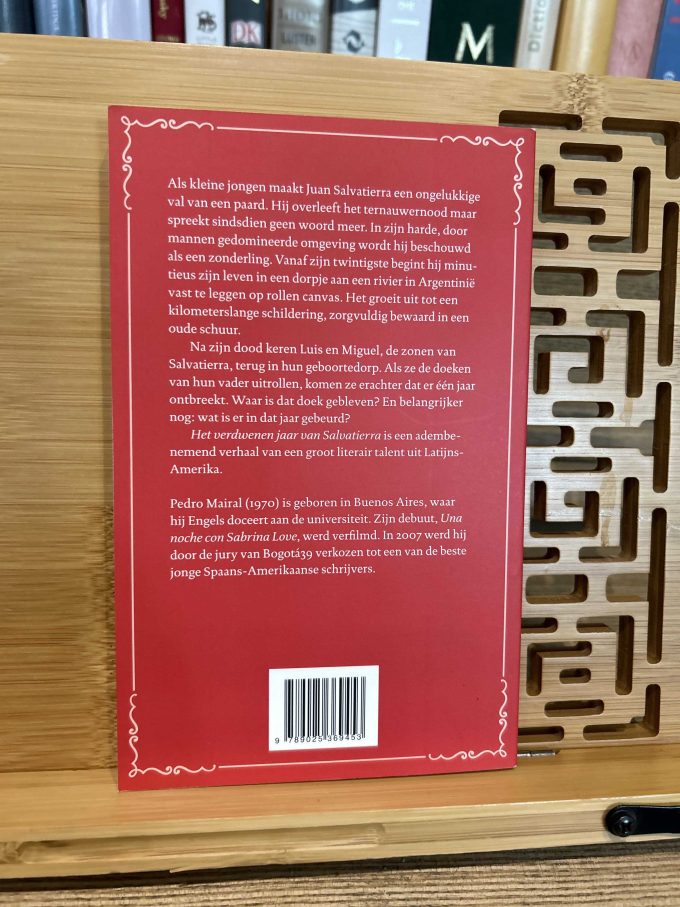 Het verdwenen jaar van Salvatierra, translated from the Spanish Salvatierra by Corrie Rasink, is a novel by Argentine author Pedro Mairal, published in Dutch in 2012. The book tells the story of Miguel Salvatierra, who returns to his hometown after the death of his father, a quiet and reclusive painter. His father, known for his monumental mural, spent decades painting every day of his life, capturing scenes of daily life, historical events, and landscapes of the region. This mural, made up of thousands of meters of canvas, serves as a unique and invaluable visual document of local culture and history.