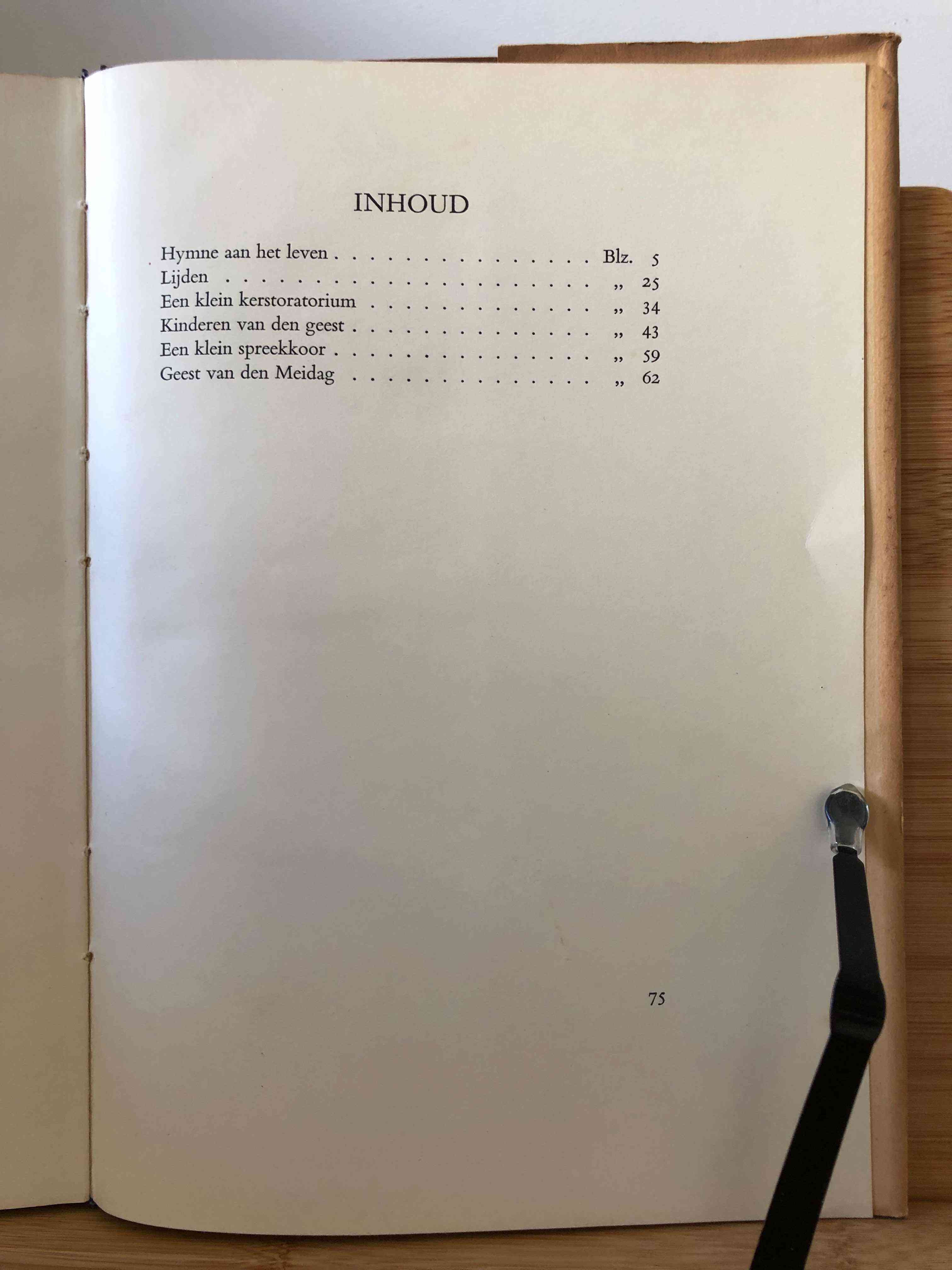 De stem die roept. Zes kleine spelen en koren (The Voice that Calls. Six Small Plays and Choirs) by Henriette Roland Holst-van der Schalk, is a collection of six plays and choirs, published in 1936 by W. L. & J. Brusse in Rotterdam. This first edition consists of 75 pages and measures 18 cm by 25.5 cm. The book is in fine condition and bound in hardcover.